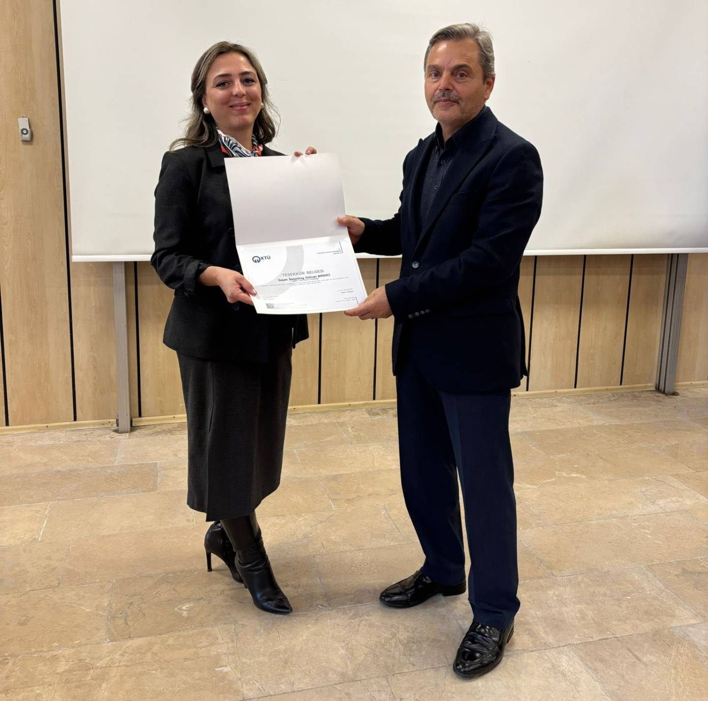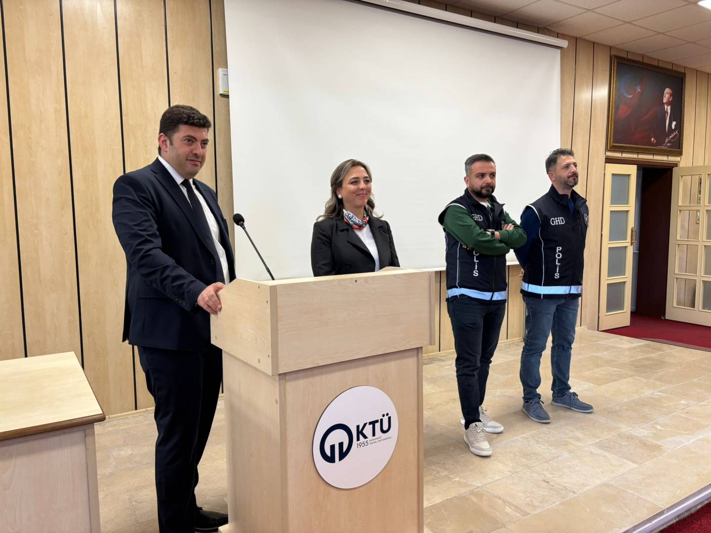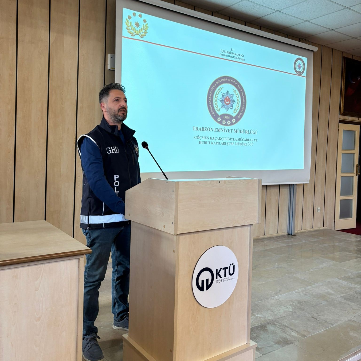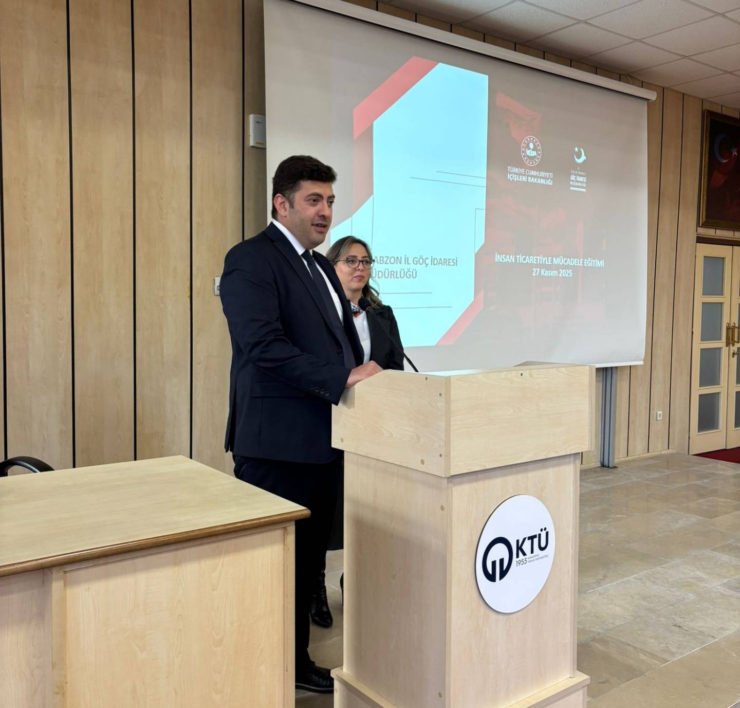 Memur Akademisi 2025–2026 Eğitim-Öğretim Yılı kapsamında düzenlenen hizmet içi eğitim programı çerçevesinde, İl Göç İdaresi Müdürlüğü, İl Emniyet Müdürlüğü ve Memur Akademisi Birimi iş birliği ile “İnsan Ticareti ile Mücadele” eğitimi KTÜ Fen Fakültesi Nazım Terzioğlu Amfisi’nde gerçekleştirildi. Eğitim, kurum içi gelişim faaliyetlerinin güçlendirilmesi ve personelin sahada insan ticaretiyle ilgili karşılaşabileceği durumlara yönelik farkındalık ve müdahale kapasitesinin artırılması amacıyla düzenlendi.