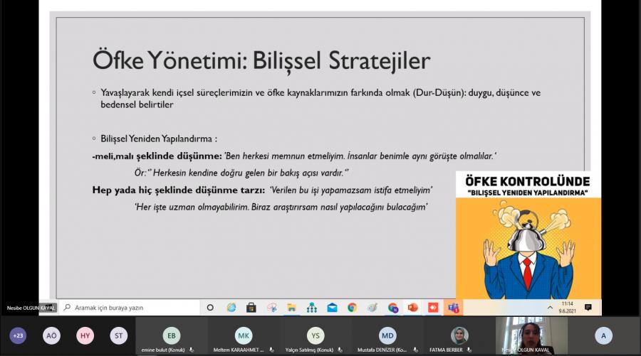 Memur Akademisi'nde bu hafta, "Öfke Yönetimi" konusu 09 Haziran 2021 Çarşamba günü 13.30-15.00 saatleri arasında, Arş. Gör. Nesibe OLGUN KAVAL tarafından online olarak işlendi ve sorular cevaplandırıldı.