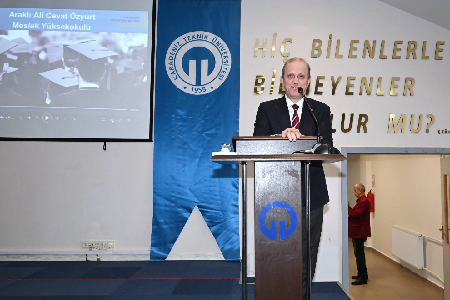 Etkinlikte ayrıca, TEKNOFEST 2025 Türkçe Doğal Dil İşleme Yarışması Senaryo Kategorisi’nde KTÜ Al-F1 Takımı ile üniversitemizi temsil ederek Türkiye 3.’sü olan Yapay Zekâ Operatörlüğü Programı 2. sınıf öğrencimiz Abdulkadir GÜRBÜZ’e başarı belgesi takdim edildi. Belge, Rektörümüz Prof. Dr. Hamdullah ÇUVALCI, Meslek Yüksekokulu Müdürümüz Prof. Dr. Özcan ÖZYURT ve Araklı Belediye Başkanı Hüseyin Avni Coşkun ÇEBİ tarafından verildi.