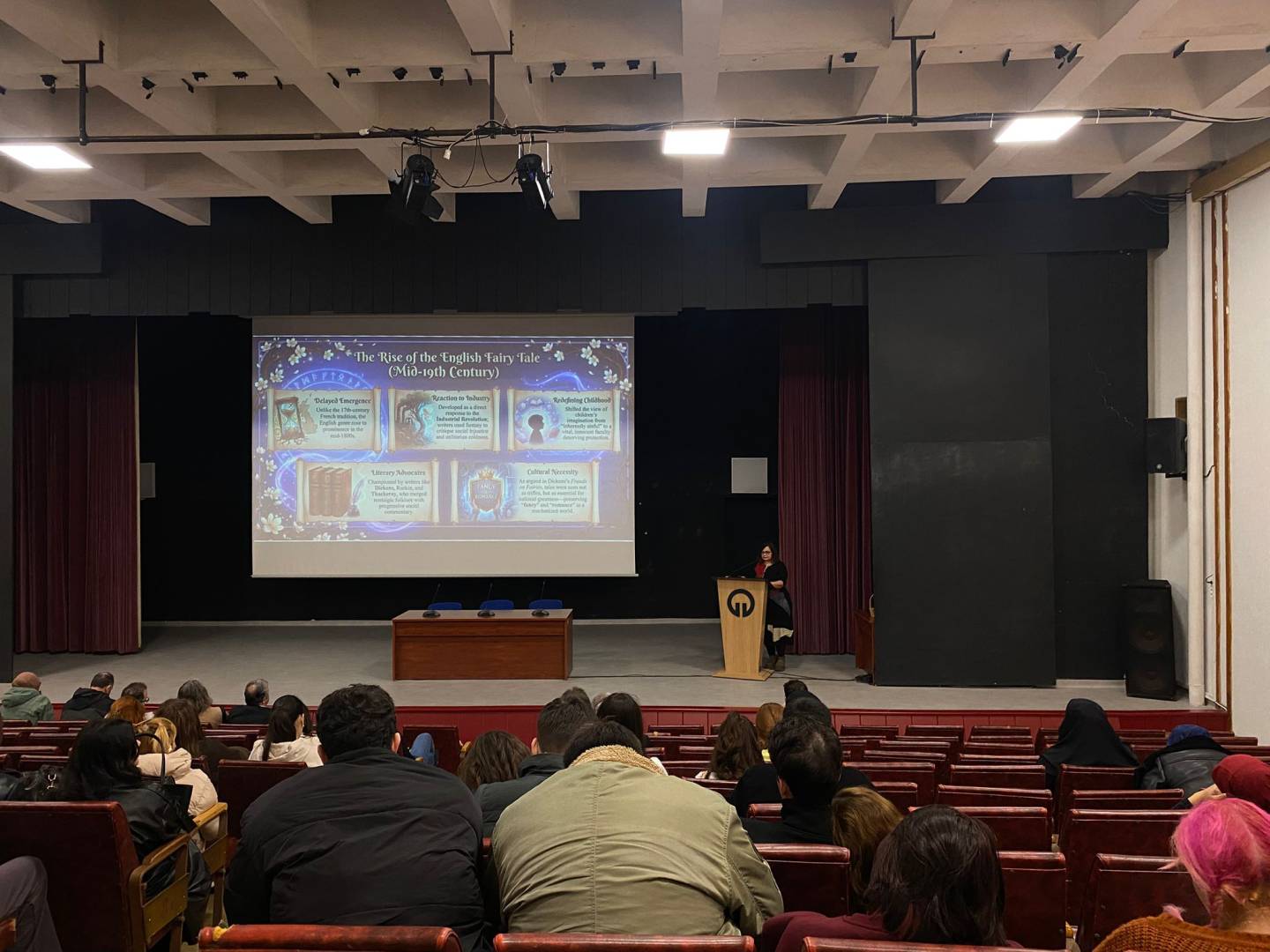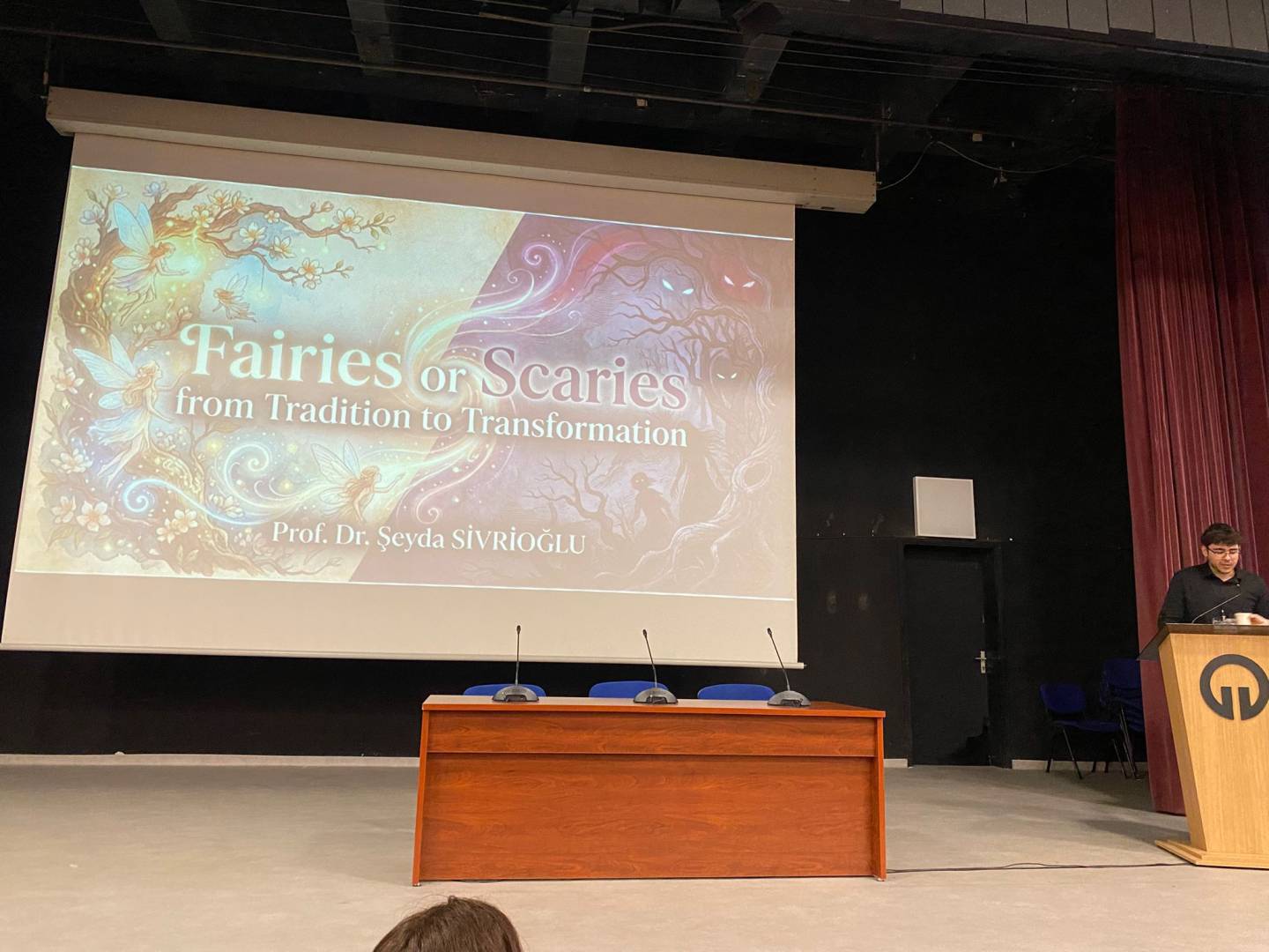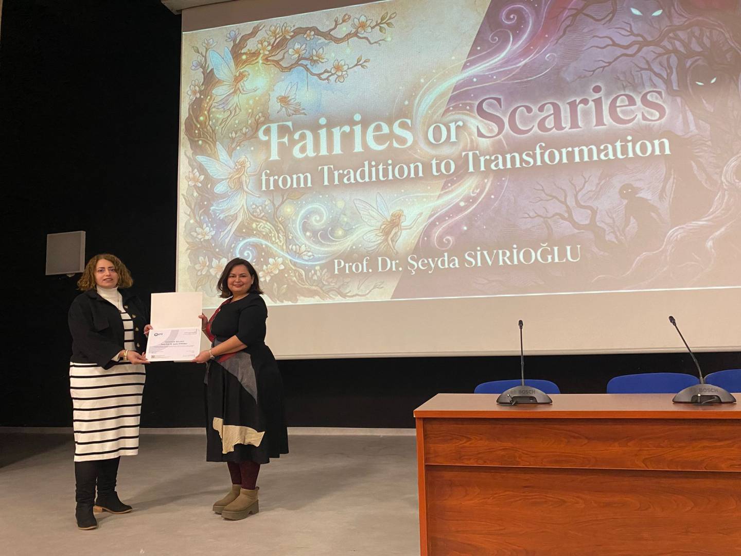 “FAIRIES OR SCARIES? From Tradition to Transformation: Challenging Grand Narratives of Fairy Tales” başlıklı seminerde Prof. Dr. SİVRİOĞLU, masalların geleneksel anlatı yapılarının zaman içinde nasıl dönüştüğünü ele aldı. Sunumda masalların yalnızca çocuk edebiyatına ait metinler olarak değil; toplumsal, kültürel ve ideolojik boyutları olan anlatılar olarak okunabileceği üzerinde duruldu.