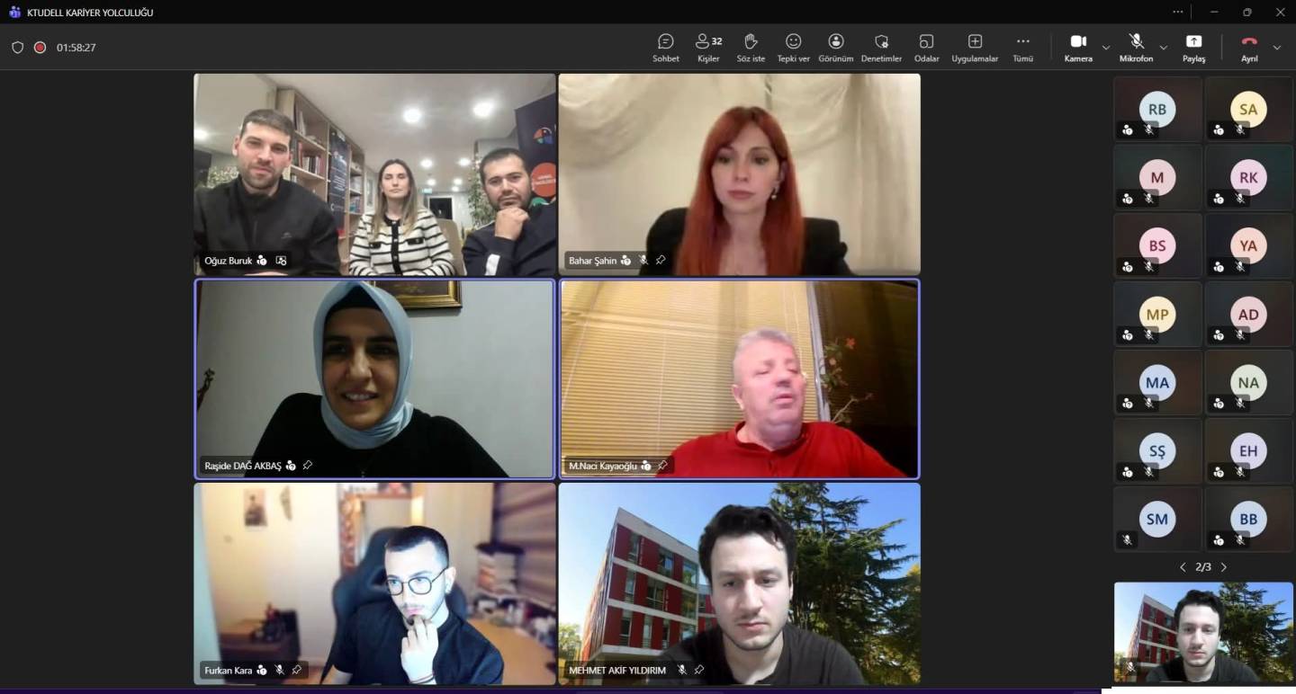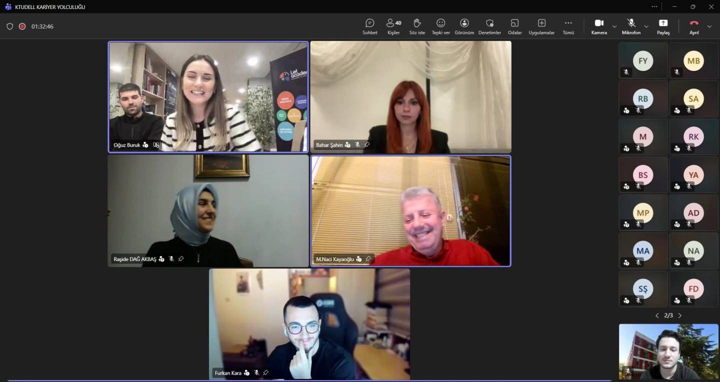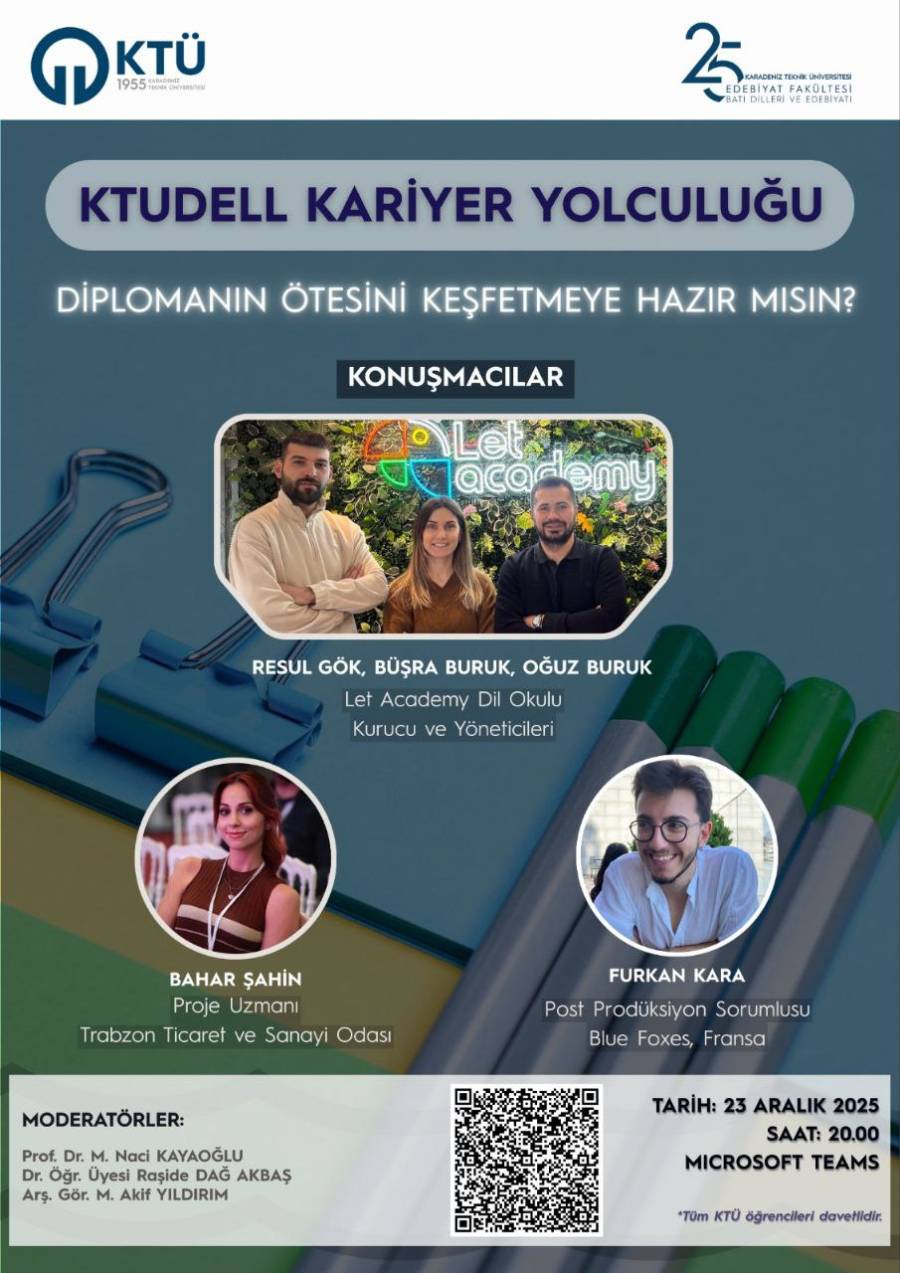 23.12.2025 tarihinde bölüm başkanımız Prof. Dr. Mustafa Naci Kayaoğlu, Dr. Öğr. Üyesi Raşide Dağ Akbaş ve Arş. Gör. Mehmet Akif Yıldırım moderatörlüğünde, mezunlarımız olan Let Academy Dil Okulu, Trabzon Ticaret ve Sanayi Odası ve Blue Foxes temsilcilerinin katılımı ile KTUDELL Kariyer Yolculuğu etkinliği gerçekleştirildi.