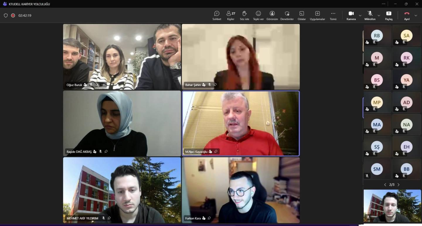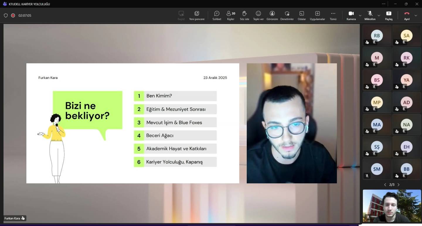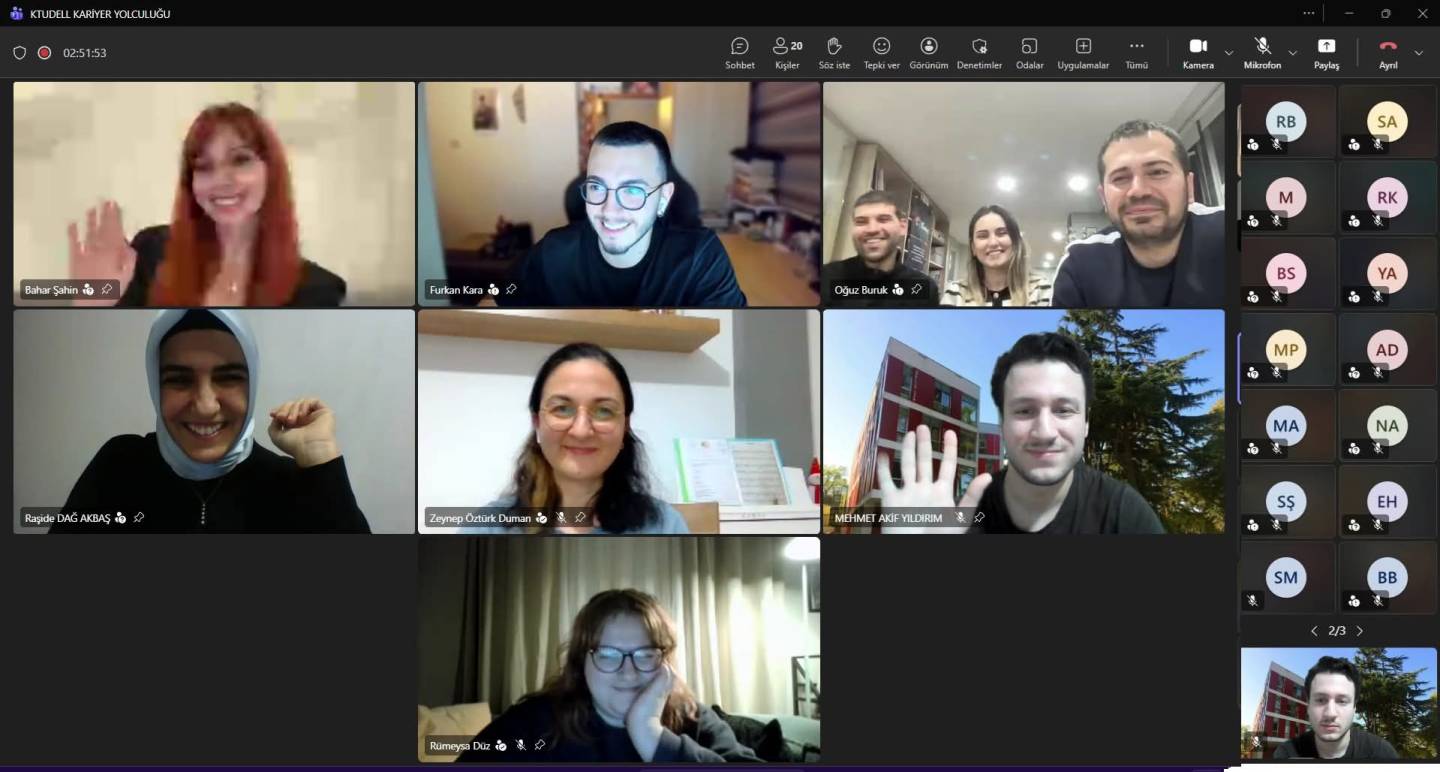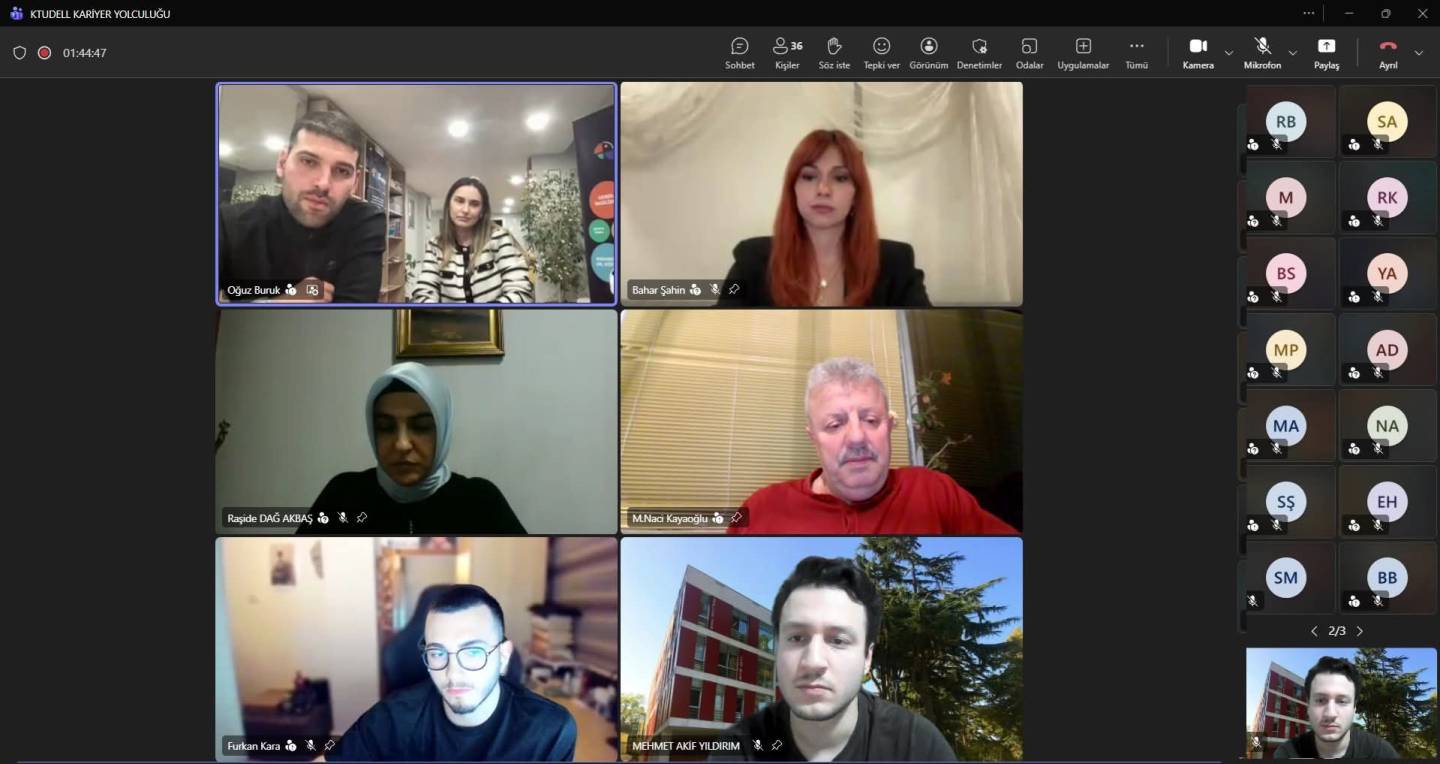 23.12.2025 tarihinde bölüm başkanımız Prof. Dr. Mustafa Naci Kayaoğlu, Dr. Öğr. Üyesi Raşide Dağ Akbaş ve Arş. Gör. Mehmet Akif Yıldırım moderatörlüğünde, mezunlarımız olan Let Academy Dil Okulu, Trabzon Ticaret ve Sanayi Odası ve Blue Foxes temsilcilerinin katılımı ile KTUDELL Kariyer Yolculuğu etkinliği gerçekleştirildi.