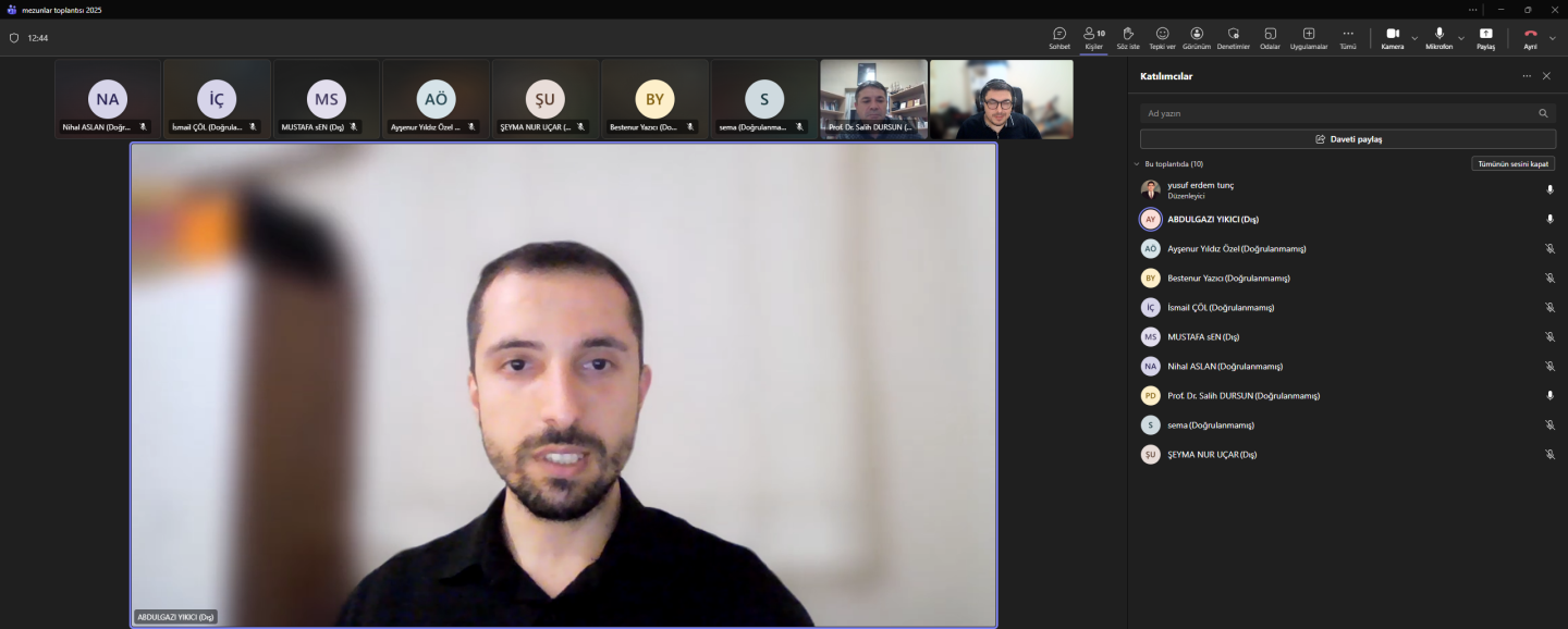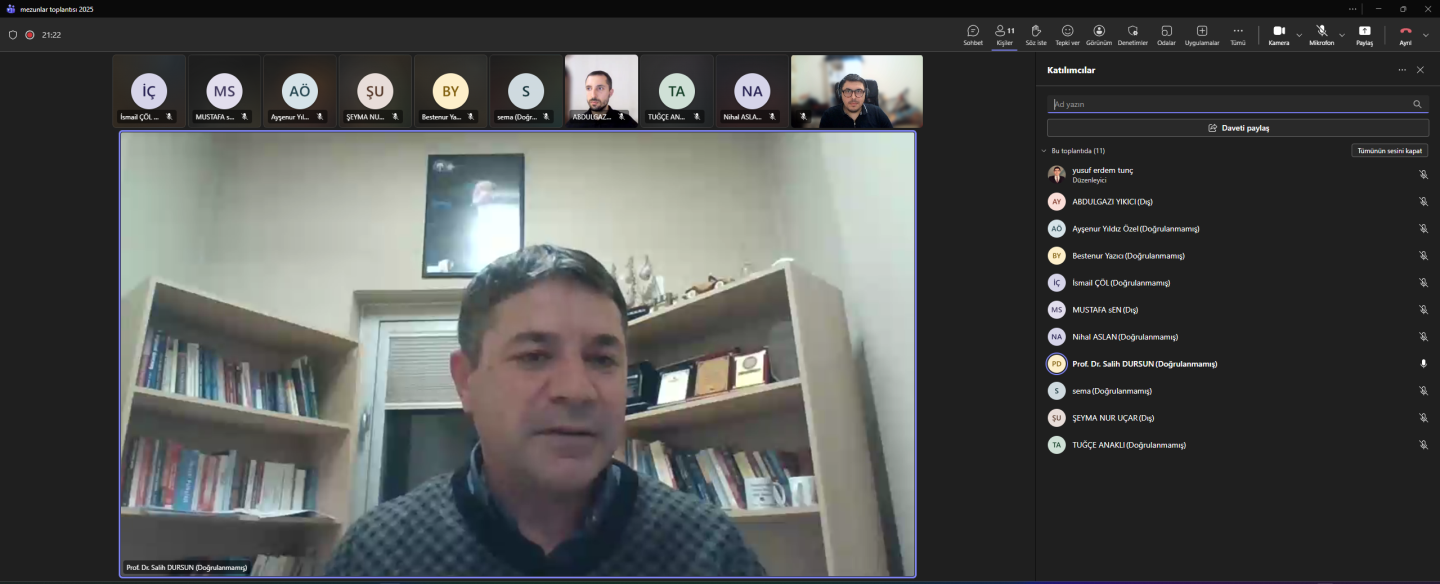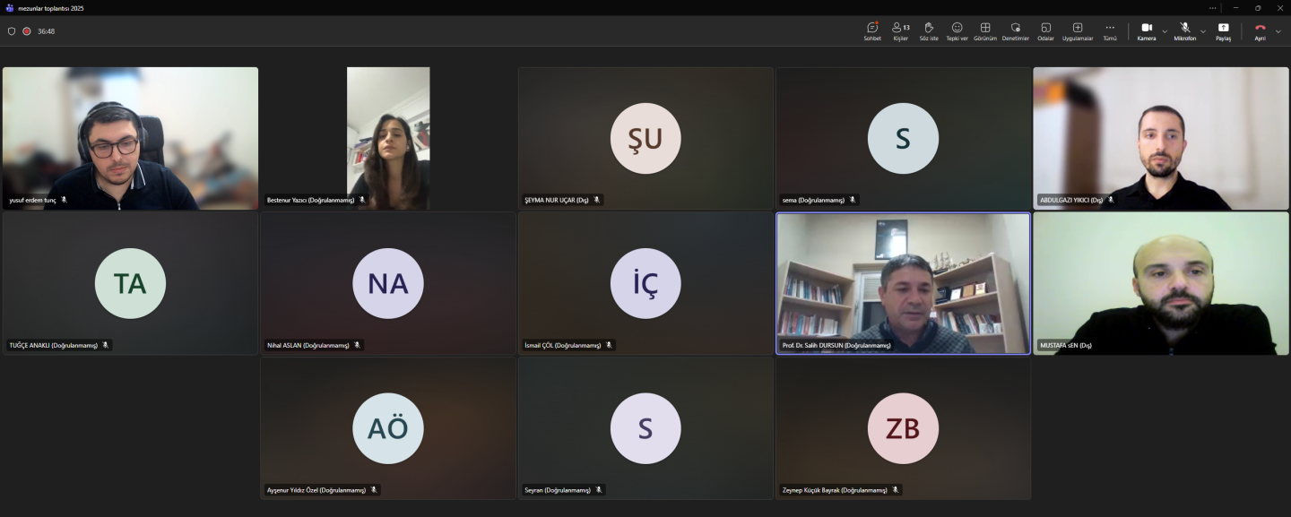 Bölüm Başkan Yardımcımız Dr. Öğr. Üyesi Yusuf Erdem TUNÇ moderatörlüğünde gerçekleşen toplantıya; Sosyal Bilimler Enstitüsü Müdür Yardımcısı Dr. Öğr. Üyesi Abdulgazi YIKICI, Bölüm Başkanımız Prof. Dr. Salih DURSUN, Bölüm Başkan Yardımcımız Doç. Dr. Mustafa ŞEN ve mezunlarımız katılım sağladı.