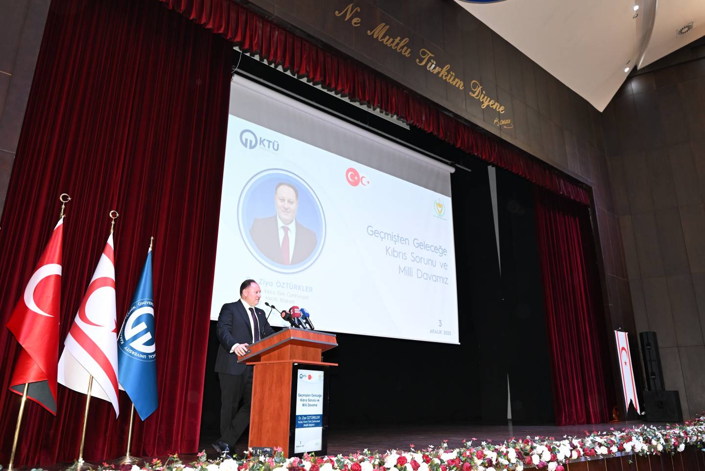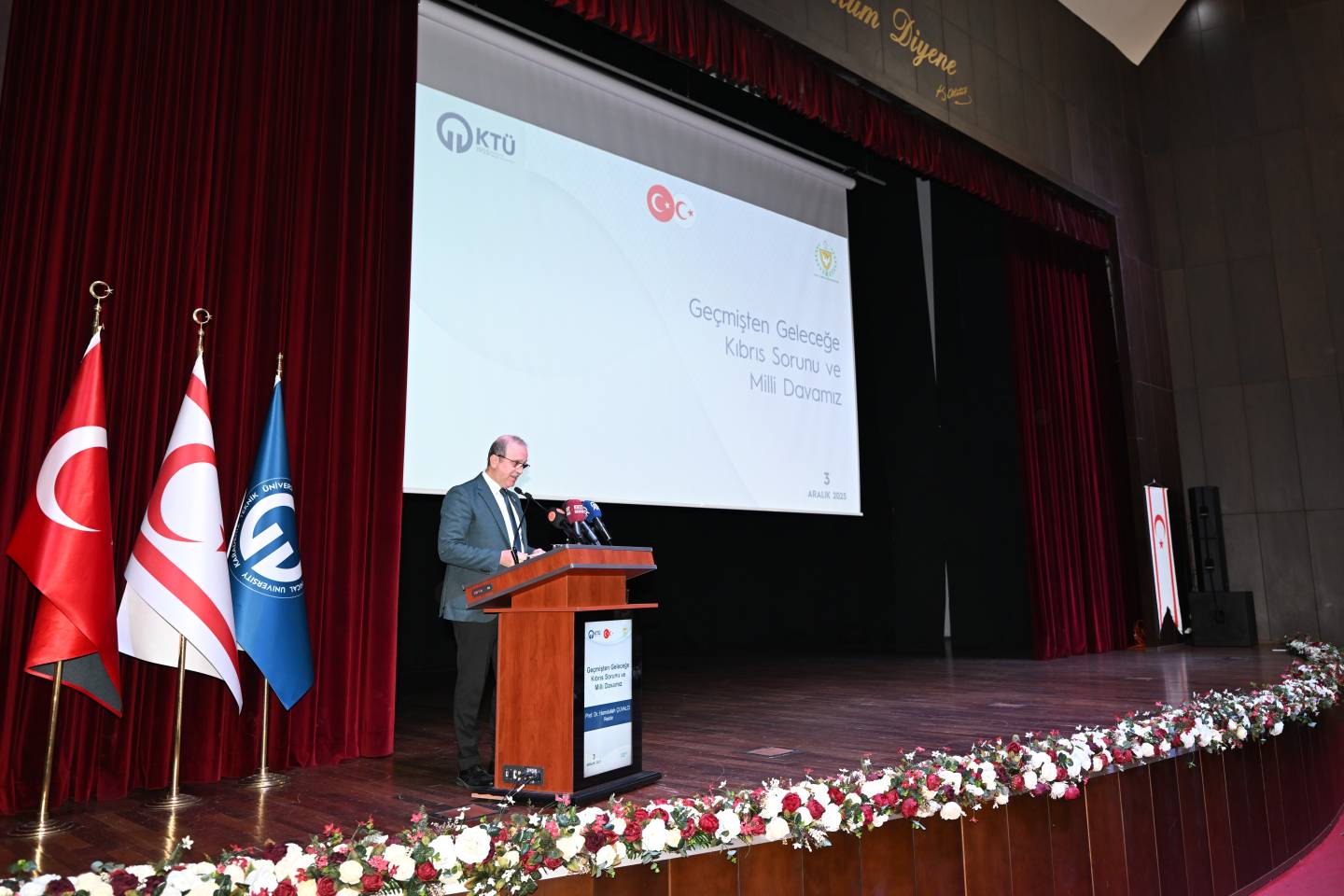 The program began with a moment of silence and the Turkish National Anthem, followed by the screening of the “KTU Introductory Film” and the themed video “Independence Is in Our Spirit,” prepared by our University’s Corporate Communication Office Radio/TV Unit. In the opening remarks, Rector Prof. Dr. Hamdullah ÇUVALCI emphasized the significance of gathering to revisit the historical memory of the Cyprus issue and to strengthen a shared awareness for the future. He noted that hosting Dr. Ziya ÖZTÜRKLER, Speaker of the Parliament of the Turkish Republic of Northern Cyprus, was a great honor for the University. Rector ÇUVALCI underlined that Dr. ÖZTÜRKLER’s extensive experience, both in academia and public service, offers valuable insights into the Cyprus question. He stressed that the conference would not only provide an overview of past developments but also contribute to a forward-looking understanding of the issue. Highlighting the multifaceted nature of the Cyprus cause, the Rector stated that it is more than a geographical matter; it carries historical, political, cultural, and identity-based dimensions that deeply resonate within the Turkish nation. He emphasized that the Cyprus cause is a national responsibility that every generation must understand anew and protect. Within this context, he pointed out that the program holds particular importance for strengthening young people’s sense of history and awareness of national issues.