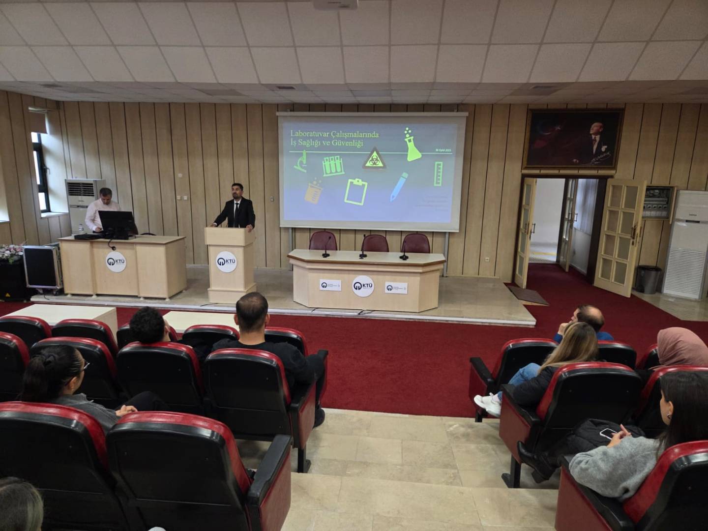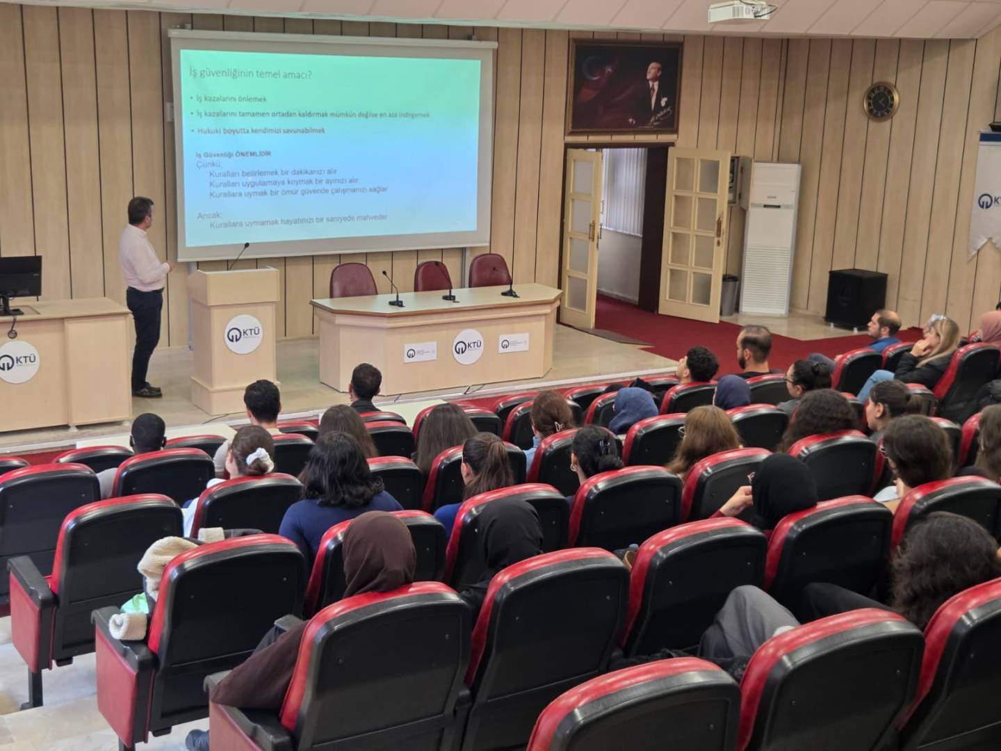 Eğitimin konuşmacısı, İş Sağlığı ve Güvenliği Uzmanı ve KTÜ Fen Bilimleri Enstitüsü İş Sağlığı ve Güvenliği Anabilim Dalı Başkanı Prof. Dr. Tayfun Dede oldu. Prof. Dr. Dede, öğrencilere iş sağlığı ve güvenliğinin temel prensipleri, risk faktörleri, laboratuvar ve çalışma alanlarında dikkat edilmesi gereken kurallar hakkında kapsamlı bilgiler aktardı. Özellikle laboratuvar çalışmalarında güvenli davranış biçimlerinin önemine vurgu yapan Dede, hem bireysel hem de toplu güvenliği sağlamak için alınması gereken önlemler üzerinde durdu.