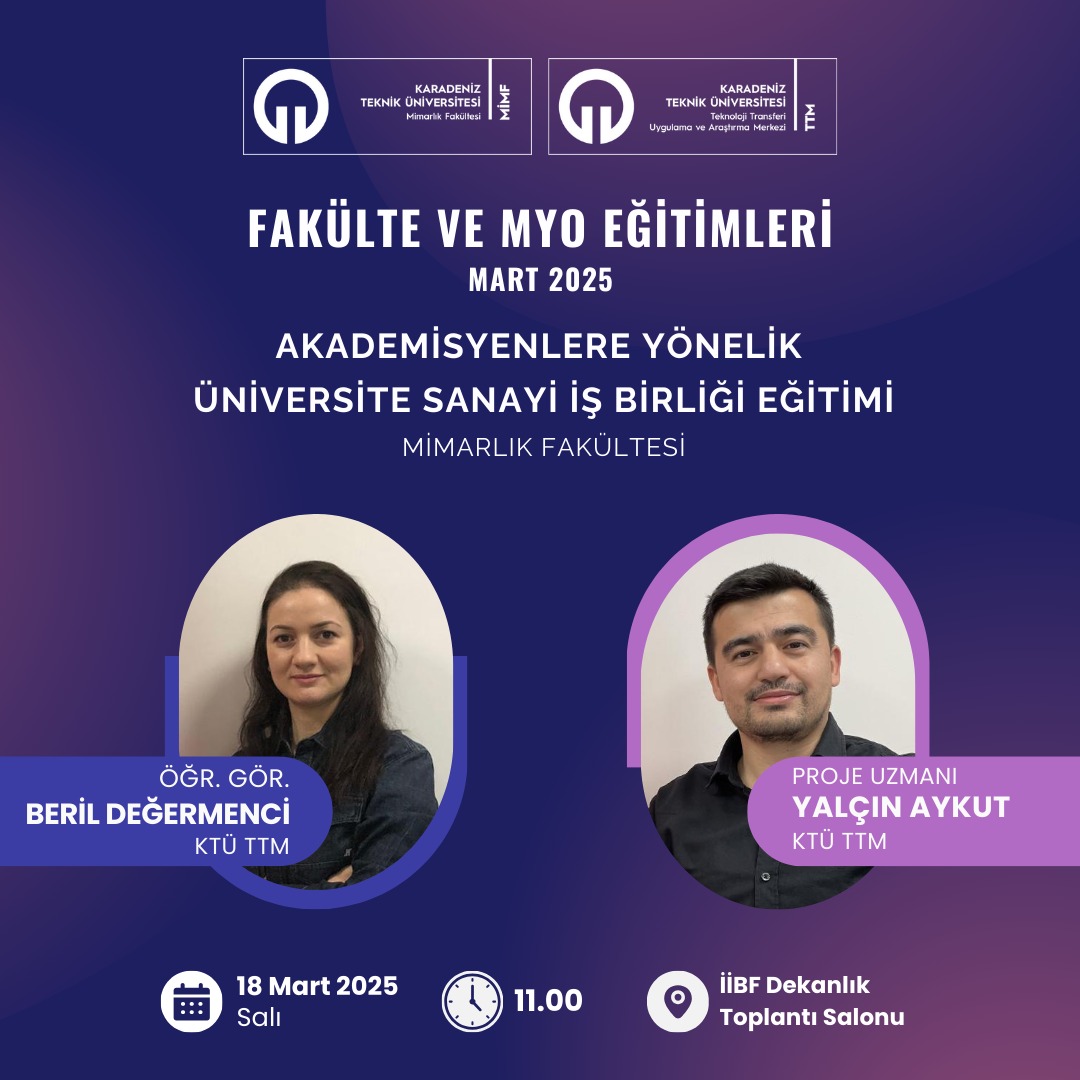 - 18 Mart 2025 Salı günü, İİBF Dekanlık Toplantı Salonu'nda saat 11:00’de Akademisyenlere Yönelik Üniversite-Sanayi İş Birliği Eğitimi düzenlenecektir. Tüm akademisyenlerimiz davetlidir.