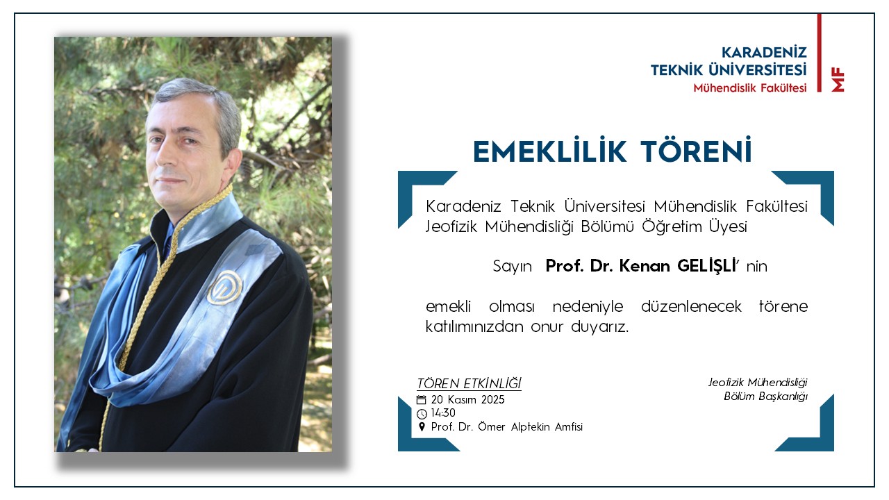 Bölümümüz hocalarından Sayın Prof. Dr. Kenan GELİŞLİ hocamızın emekliliği sebebiyle 20 Kasım 2025 Perşembe günü saat 14.30'da Jeofizik Mühendisliği Bölümü Prof. Dr. Ömer Alptekin Amfisi'nde emeklilik töreni düzenlenecektir.