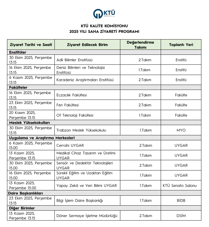 Bu yıl ilk kez değerlendirme takımlarında görev alan Öğrenci Kalite Komisyonu üyeleri ile Haziran 2025’te eğitime başlayan ve hâlen eğitimleri devam eden KALPER personellerimiz, ziyaretlere gözlemci olarak katılım sağladı. Ziyaretlerde ilgili birimlerin yöneticileri ve kalite komisyonu üyeleri yer aldı. 2024 Yılı Birim İç Değerlendirme Raporlarının içeriği ile çalışma konularına ilişkin faaliyetler yerinde değerlendirildi.