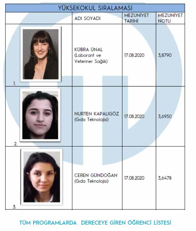 2019/2020 Eğitim Öğretim Yılı, 22. Dönem Mezunları Dereceye Giren Öğrenciler