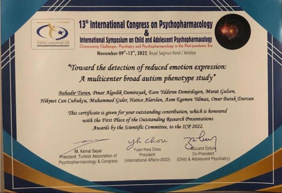 13. Uluslararası Psikofarmakoloji kongresinde en iyi araştırma ödülü kategorisinde 1.lik ödülünü almaya hak kazandı.