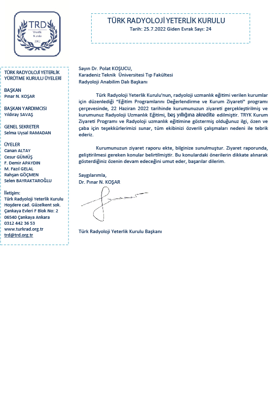 Türk Radyoloji Yeterlik Kurulu'nun, radyoloji uzmanlık eğitimi verilen kurumlar için düzenlediği “Eğitim Programlarını Değerlendirme ve Kurum Ziyareti" programı çerçevesinde, 22 Haziran 2022 tarihinde Fakültemiz Radyoloji Anabilim Dalı kurum ziyareti gerçekleştirilmiş ve Radyoloji Anabilim Dalı Uzmanlık Eğitimi, beş yıllığına akredite edilmiştir.