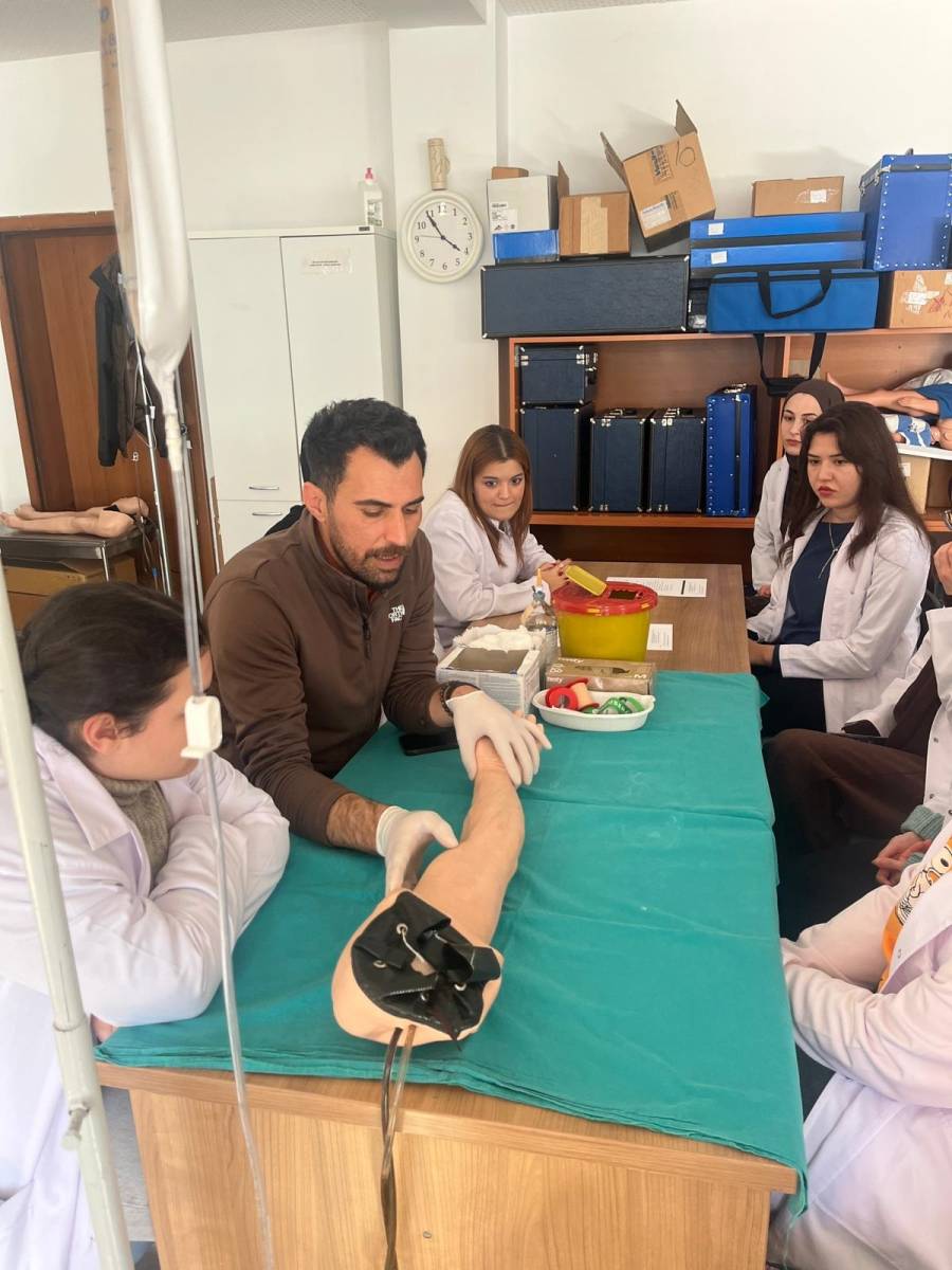Etkinlik kapsamında, öğrencilere yönelik temel klinik beceriler üzerine bilgilendirme ve uygulama çalışmaları gerçekleştirildi. Dört istasyondan oluşan eğitimde, katılımcılara bandaj uygulama, damar yolu açma, intramüsküler enjeksiyon ve tansiyon ölçme hakkında teorik bilgiler aktarıldı ve ardından her öğrenci bu becerileri uygulamalı olarak deneyimleme fırsatı buldu.