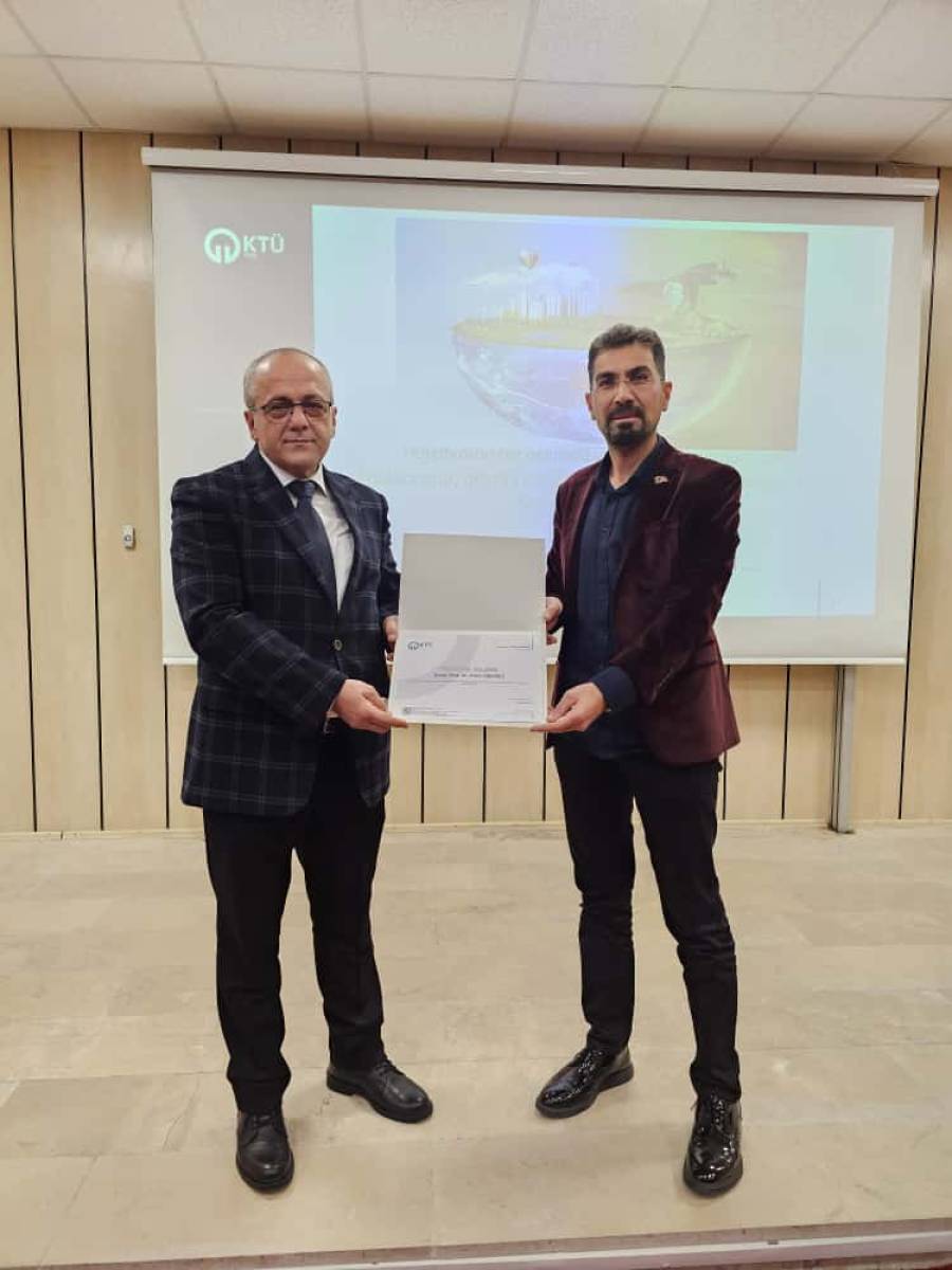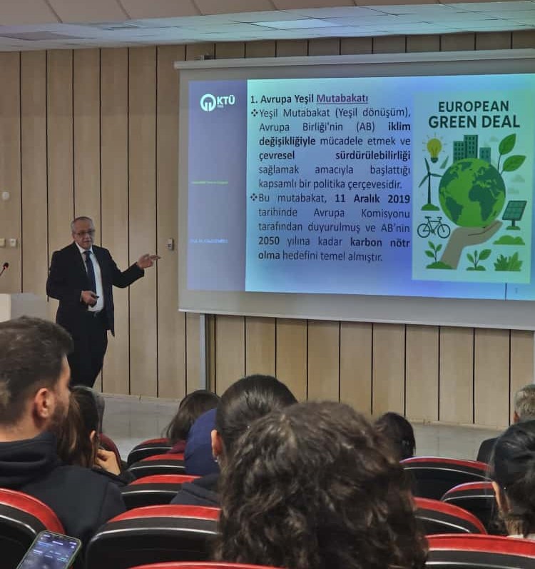13 Kasım 2025 Perşembe günü saat 14.00’te Nazım Terzioğlu Amfisi’nde, KTÜ Gen öğrenci kulübümüz ve Moleküler Biyoloji ve Genetik Bölümü iş birliği ile düzenlenen bölüm seminerlerinin ikincisi sürdürülebilirlik ve Yeşil Mutabakat konularına dikkat çekmek amacıyla gerçekleştirildi. Seminere konuşmacı olarak bölümümüz öğretim üyelerinden Prof. Dr. Erkol Demirci, ‘Sürdürülebilir Tarım ve Funguslar’ başlıklı sunumu ile katıldı. Etkinlikte, sürdürülebilirlik politikalarının bilimsel, çevresel ve toplumsal yönleri ele alınarak kapsamlı bilgiler aktarıldı.