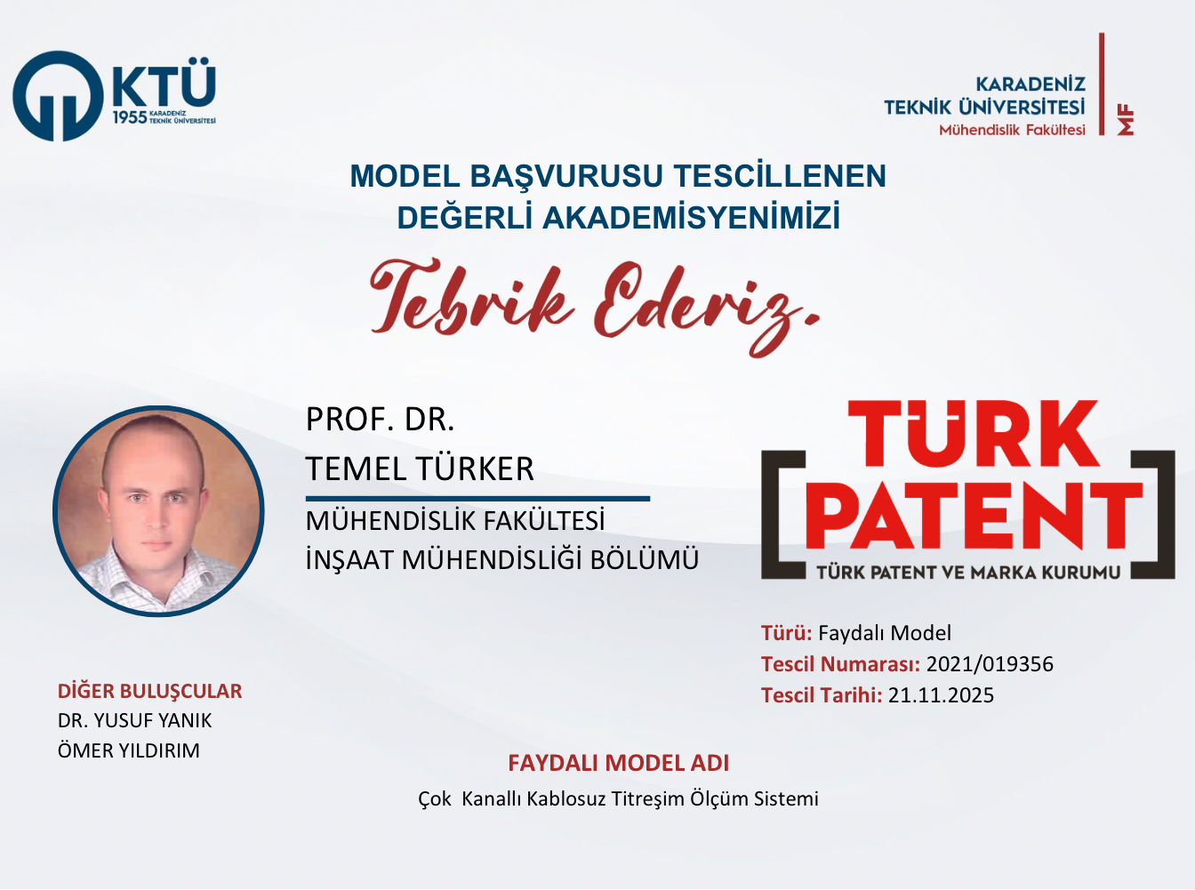 Fakültemiz İnşaat Mühendisliği Bölümü öğretim üyesi Prof. Dr. Temel TÜRKER'in "Çok Kanallı Kablosuz Titreşim Ölçüm Sistemi" isimli faydalı model başvurusu tescillenmiştir. Başvurusu tescillenen akademisyenimizi tebrik eder, başarılarının devamını dileriz.