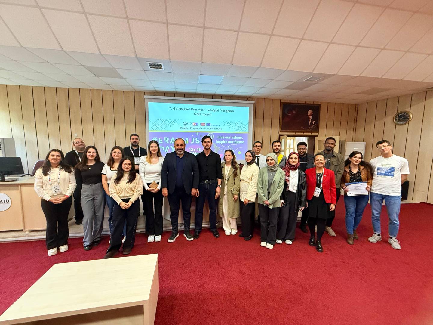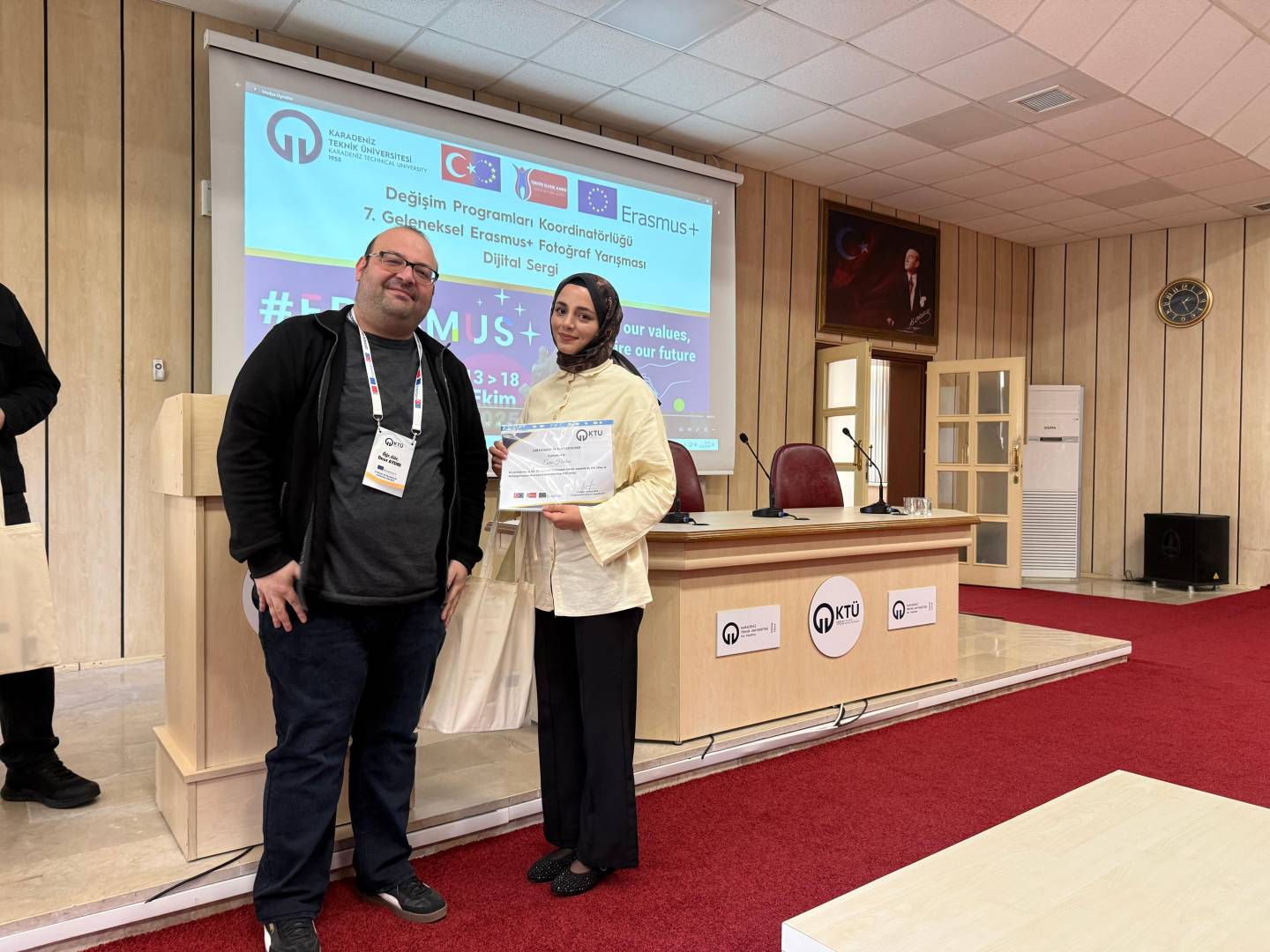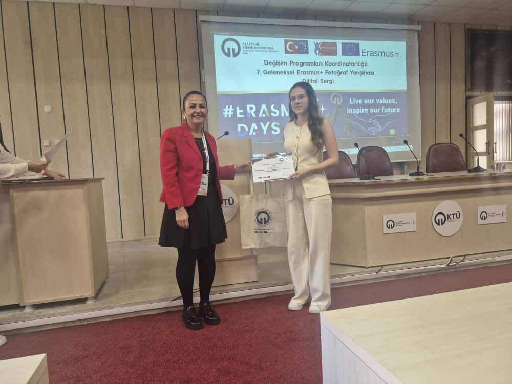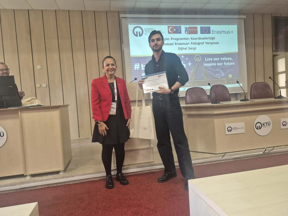 Bu yıl da hem dünyanın farklı ülkelerindeki hem de ülkemizdeki diğer üniversiteler ile eş zamanlı olarak, Üniversitemiz Değişim Programları Koordinatörlüğü’nün organizasyonuyla KTÜ Erasmus Günleri 2025 etkinlikleri 13-14-15 Ekim 2025 tarihlerinde düzenlendi. Etkinlikler kapsamında ayrıca 7. Geleneksel Erasmus+ Fotoğraf Yarışması düzenlendi. Yarışmada daha önce Erasmus+ programından faydalanmış öğrencilerin fotoğrafları yarıştı. Etkinliğin birinci gününde yarışmaya katılım sağlayan öğrencilerin fotoğrafları dijital sergi olarak Koordinatörlüğümüzün sosyal medya hesaplarında paylaşıldı. Etkinliğin ikinci gününde oylama sonucu ilk üçe giren fotoğrafların sahibi öğrencilerimiz için Fen Fakültesi Nazım Terzioğlu Amfisi'nde ödül töreni düzenlendi. Dereceye giren öğrencilerimize hediyeleri Dış İlişkiler Genel Koordinatörü Prof. Dr. Sercan EROL ve Değişim Programları Koordinatörlüğü ekibi tarafından takdim edildi. Ödül töreninin ardından Değişim Programları Koordinatörlüğü tarafından Erasmus+ Öğrenci Öğrenim ve Staj Hareketliliği programları hakkında bilgilendirme toplantısı düzenlendi. Etkinliğin son gününde daha önce Erasmus+ programından faydalanmış öğrencilerimiz deneyimlerini anlatan sunumlar gerçekleştirdiler ve Erasmus Student Network'ün KTÜ'deki temsilcisi olan ESN Trabzon tarafından ESN öğrenci topluluğunu tanıtan bir sunum gerçekleştirildi. Etkinliklere ve fotoğraf yarışmasına katılan tüm öğrencilerimize teşekkür ederiz.