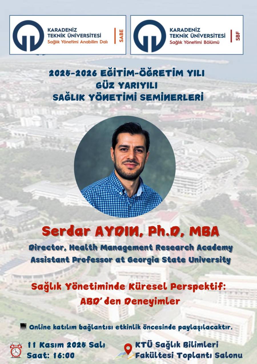 Karadeniz Teknik Üniversitesi Sağlık Bilimleri Fakültesi Sağlık Yönetimi Bölümü tarafından 2025-2026 Eğitim-Öğretim Yılı Güz Yarıyılı Sağlık Yönetimi Seminerleri kapsamında düzenlenen “Sağlık Yönetiminde Küresel Perspektif: ABD’den Deneyimler” başlıklı seminer 11 Kasım 2025 Salı günü gerçekleştirildi.