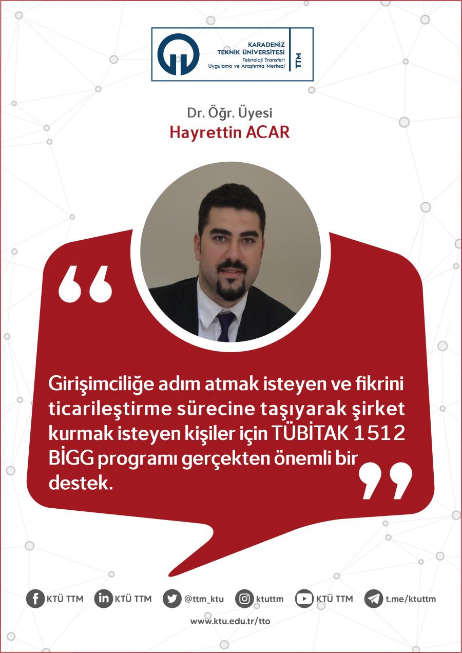Daha önce farklı TÜBİTAK destekleri için başvurular yapmış biri olarak şunu söyleyebilirim ki ticari boyutu olduğu ve prototip üretimi gerektiği için BİGG programı daha karmaşık bir başvuru süreci içeriyor. Ancak BİGG başvuru süreci başlamadan önce bilgilendirme duyurularının yapılması, proje yazım hazırlıkların tamamlanması ve proje sonuçlarının açıklamasından sonra dahi KTÜ TTM hep bizlerin yanında olmuştur. Proje süresince verilen eğitimler, çeşitli materyaller ve özellikle birebir verilen mentorluk destekleri bizim için çok faydalı oldu. KTÜ TTM bu konuda gerçekten çok tecrübeli ve projelerimizin desteklenmesi konusunda çok büyük pay sahibidir.''