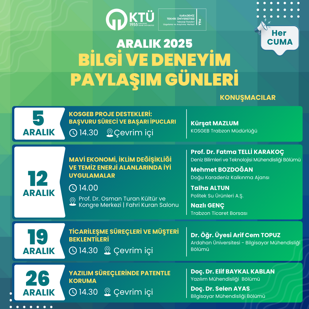 KTÜ TTM'nin düzenlediği "Bilgi ve Deneyim Paylaşım Günleri", bilgi ve deneyim paylaşımını artırarak akademi, sanayi ve girişimcilik ekosistemleri arasında güçlü bir iletişim ağı oluşturmayı hedeflemektedir. Bu kapsamda düzenlenecek etkinlikler, çevrim içi olarak gerçekleştirilecektir.