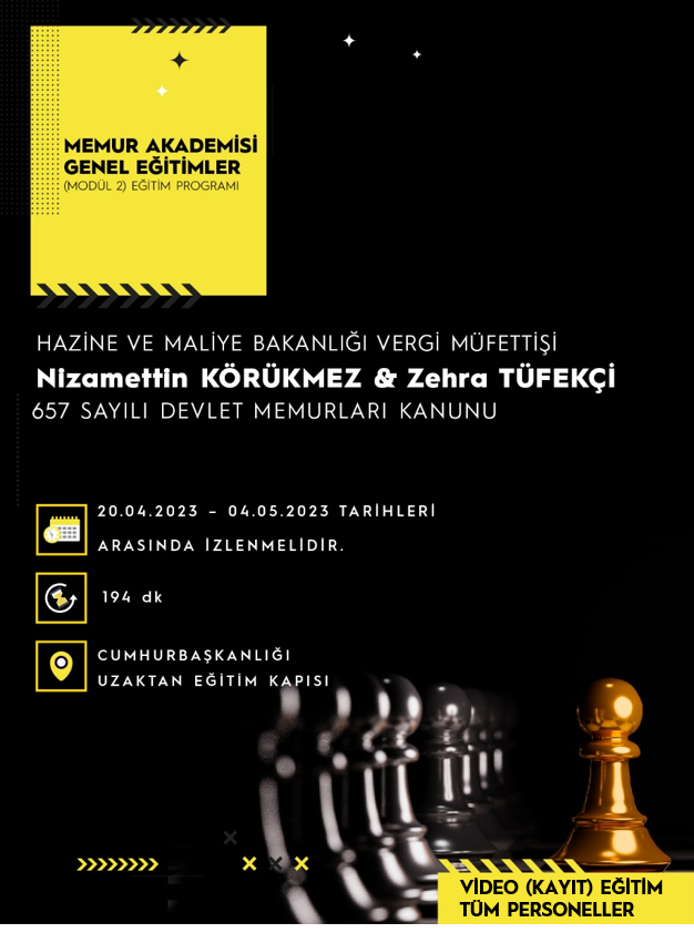 Hazine ve Maliye Bakanlığı Vergi Müfettişleri Nizamettin KÖRÜKMEZ ve Zehra TÜFEKÇİ tarafından Cumhurbaşkanlığı İnsan Kaynakları Ofisi (CBİKO) Uzaktan Eğitim Sistemi aracılığıyla 657 Devlet Memurları Kanunu video (kayıt) eğitimi olarak gerçekleştirilecektir.