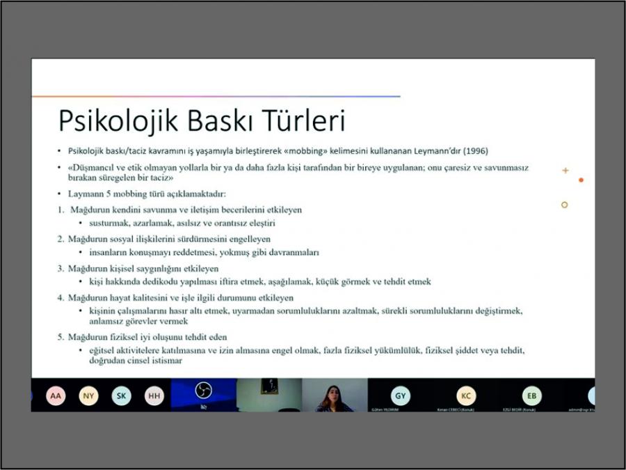 İşyerinde Psikolojik Baskı eğitimini 06.01.2020 Çarşamba günü 10.00 - 12.00 saatleri arasında Arş. Gör. Elif USTA online olarak gerçekleştirdi. Eğitimlerin sonunda dinleyicilerin soruları cevaplandırıldı.