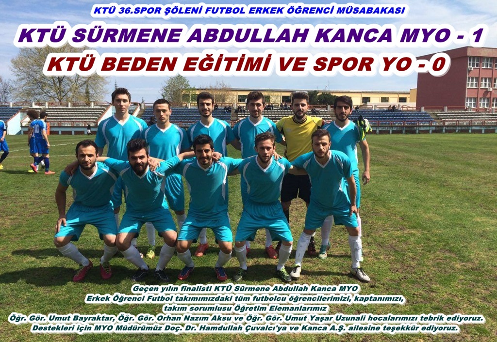 KTÜ 36. Spor Şöleni kapsamında, KTÜ Merkez Kampüs'te, BESYO ile karşılaşan, geçen yılın finalisti KTÜ Sürmene Abdullah Kanca MYO Erkek Öğrenci Futbol takımımız karşılaşmadan 1-0 galip ayrıldı. Tüm futbolcu öğrencilerimizi, takım kaptanımızı, futbol takımı sorumlusu Öğretim Elemanlarımız Öğr. Gör. Umut Bayraktar, Öğr. Gör. Orhan Nazım Aksu ve Öğr. Gör. Umut Yaşar Uzunali hocalarımızı tebrik ediyoruz. Destek ve katkıları için MYO Müdürümüz Doç. Dr. Hamdullah Çuvalcı hocamıza ve Kanca A.Ş. ailesine teşekkür ediyoruz.