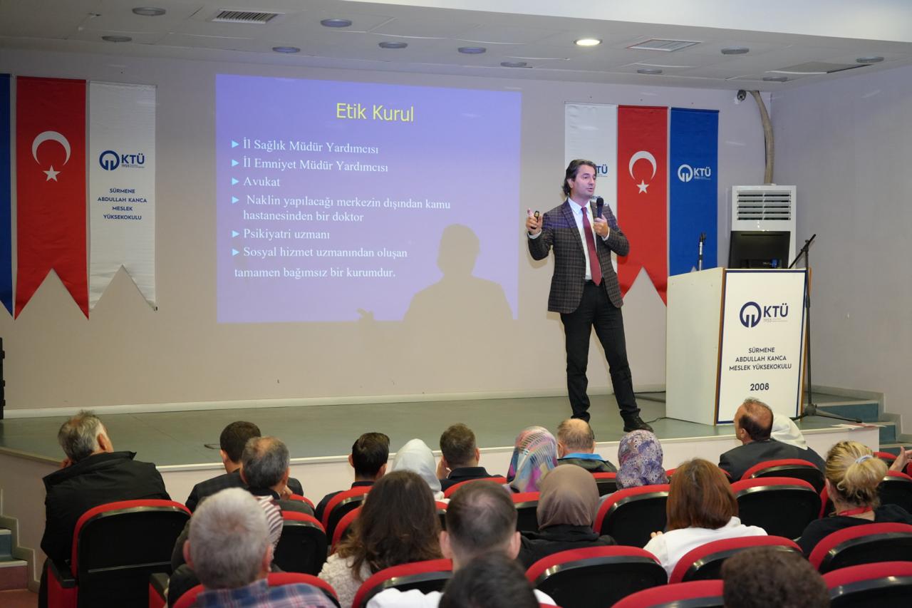 3-9 Kasım Organ Bağışı Haftası kapsamında gerçekleştirilen organizasyonda,   bilgilendirme konferansını; Organ ve Doku Nakli Koordinasyon Merkezi, Trabzon İl Sağlık Müdürlüğü, Sağlık Hizmetleri Başkanı Op. Dr. Yavuz ÇAKIROĞLU’ nun yaptığı etkinliğe; Sürmene İlçe Sağlık Müdürü Dr. Hasan BABAYİĞİT, Sürmene Devlet Hastanesi Başhekim Yardımcısı Dr. Burak ÇELENK, Hastane Müdür Yardımcısı Fatih KURT, sağlık çalışanları, davetliler, Meslek Yüksekokulumuz Akademik ve İdari personeller ile öğrencilerimizin katılımı ile gerçekleşti. Sağlık Hizmetleri Başkanı Op. Dr. Yavuz ÇAKIROĞLU yaptığı konuşmada; Ülkemizde organ bekleyen hastalar için,  kadavradan organ bağışı sayısının arttırılması amacıyla, her bir bireyin de kampanyaya destek olmaları gerektiğinin vurgulandı bilgilendirme konferansı, konuk ve davetlilerden gelen soru ve cevaplar ile son buldu.