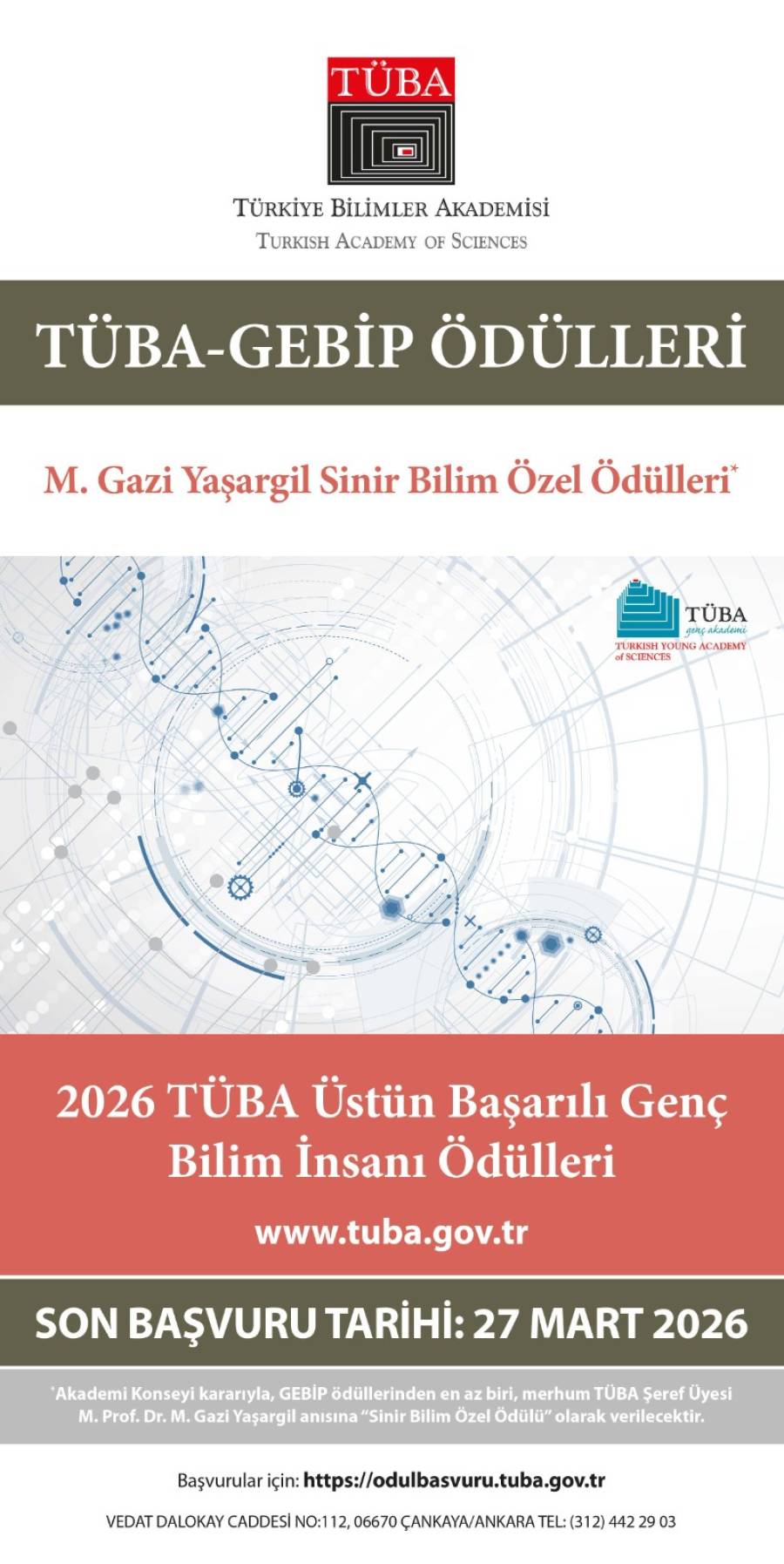 Türkiye Bilimler Akademisi (TÜBA) tarafından yürütülen TÜBA-Üstün Başarılı Genç Bilim İnsanı Ödülleri (GEBİP) ve TÜBA Bilimsel Telif Eser Ödülleri (TESEP) için 2026 yılı başvuruları başlamıştır.