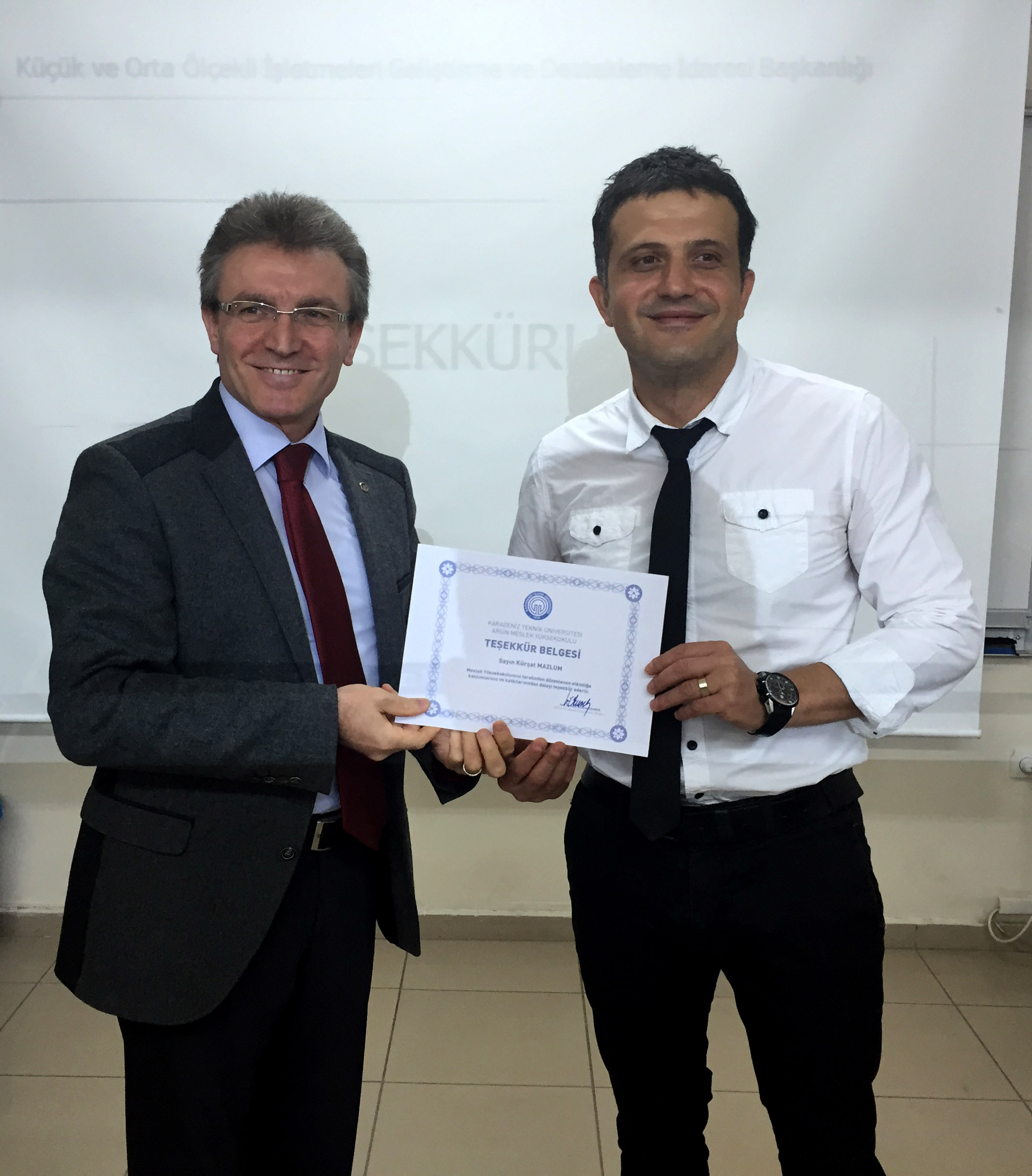 Meslek Yüksek Okulumuzda KOSGEB hibeleri hakkında bilgilendirme etkinliği düzenlendi. Etkinliğe Küçük ve Orta Ölçekli İşletmeleri Geliştirme ve Destekleme İdaresi Başkanlığı (KOSGEB) Trabzon birimi KOBİ uzmanı Kürşat Mazlum konuşmacı olarak katıldı. KOSGEB hibeleri hakkında bilgi veren Sayın Mazlum, mezuniyet sonrası öğrencilerin sektörde kendi ayakları üzerinde durabilmeleri için KOSGEB olarak yanlarında olduklarını söyledi. Düzenlenen etkinliğin sonunda Yüksekokul Müdürümüz Doç. Dr. H. İbrahim OKUMUŞ, öğrencilerimizin gelecek planlamaları hakkında yaptığı katkıdan dolayı Sayın Mazlum’a teşekkür belgesini takdim etti.