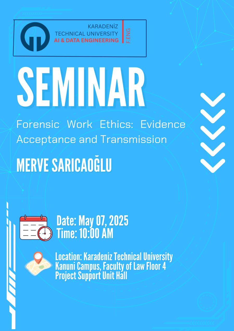 Forensic science expert Merve SARICAOĞLU will give a seminar titled “Forensic Work Ethics: Evidence Acceptance and Transmission”.