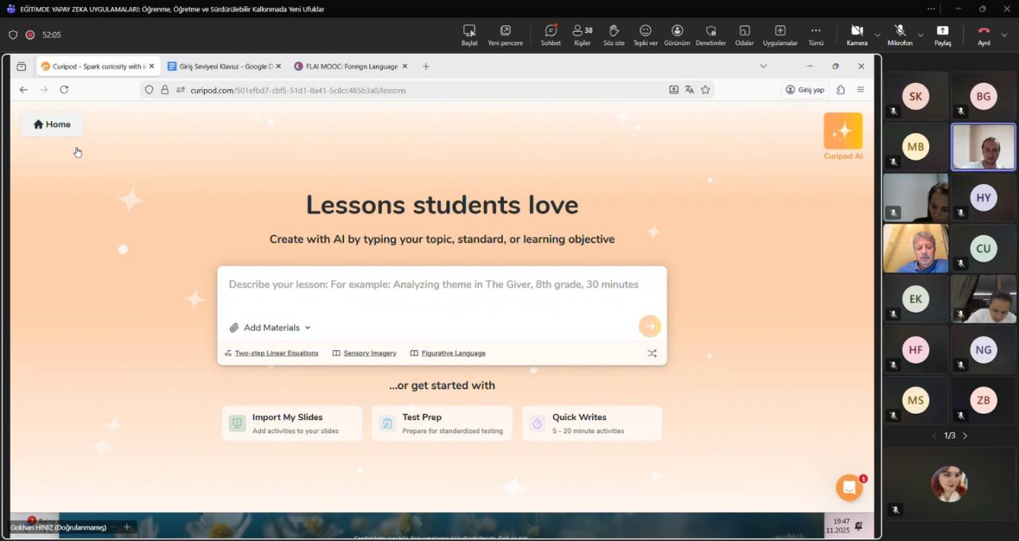 28.11.2025 tarihinde İngiliz Dili ve Edebiyatı, Rus Dili ve Edebiyatı ve Türk Dili ve Edebiyatı bölümleri olarak, Öğr. Gör. Dr. Gökhan HINIZ hocamızı "Eğitimde Yapay Zeka Uygulamaları: Öğrenme, Öğretme ve Sürdürülebilir Kalkınmada Yeni Ufuklar" başlıklı semineri ile ağırladık. Dil öğretimi, öğrenimi ve ders planı hazırlama gibi önemli konulara değinen hocamızın düzenlediği, Uluslararası Araştırmacılar Derneği destekli eğitim programlarına aşağıdaki linkler üzerinden erişebilirsiniz.