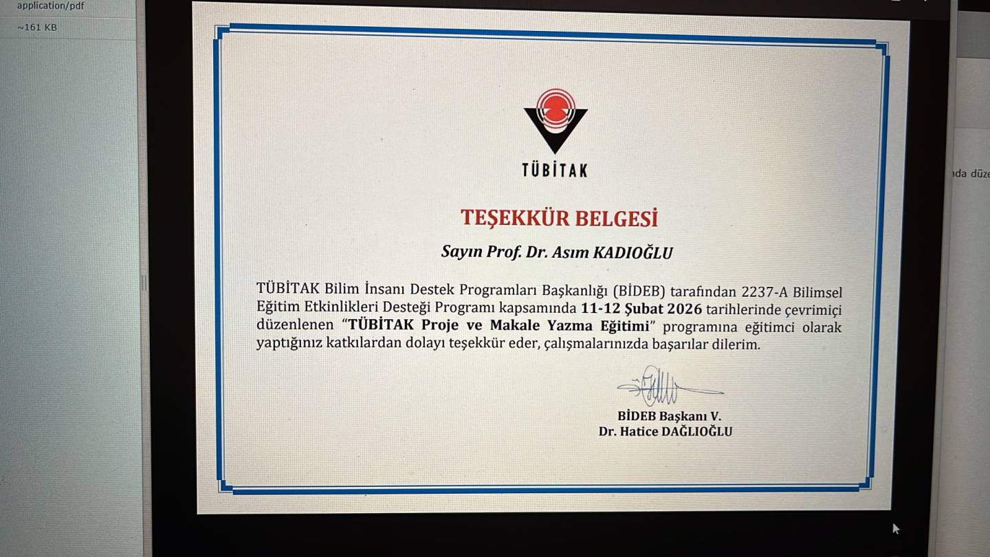 Bölüm öğretim üyelerimizden Prof. Dr. Asım KADİOĞLU 2237-A eğitim etkinlikleri kapsamında ''TÜBİTAK Proje ve Makale Yazma Eğitimi'' düzenledi.