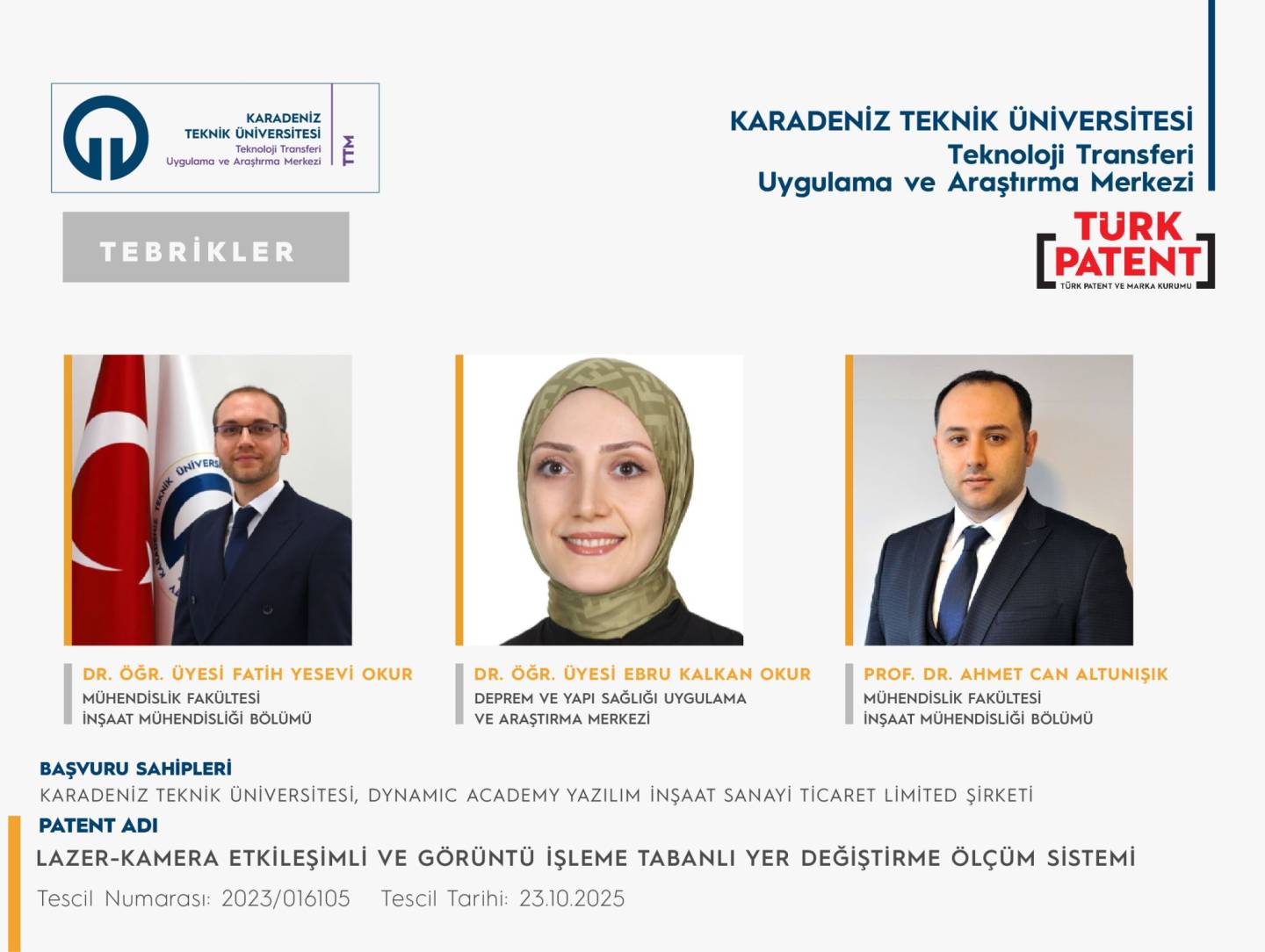 Dr. Öğr. Üyesi Fatih Yesevi Okur, Dr. Öğr. Üyesi Ebru Kalkan Okur ve Prof. Dr. Ahmet Can Altunışık’ın başvuru sahipleri arasında yer aldığı, "Lazer-Kamera Etkileşimli ve Görüntü İşleme Tabanlı Yer Değiştirme Ölçüm Sistemi" başlıklı ulusal patent, Türk Patent ve Marka Kurumu (TÜRKPATENT) tarafından tescil edilmiştir.