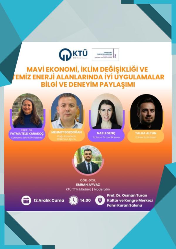 12 Aralık 2025 tarihinde, saat 14.00-15.00 arasında düzenlenecek olan “Mavi Ekonomi, İklim Değişikliği ve Temiz Enerji Alanlarında İyi Uygulamalar Bilgi ve Deneyim Paylaşımı” Panelinde Prof. Dr. Fatma TELLİ KARAKOÇ sunum yapacaktır.