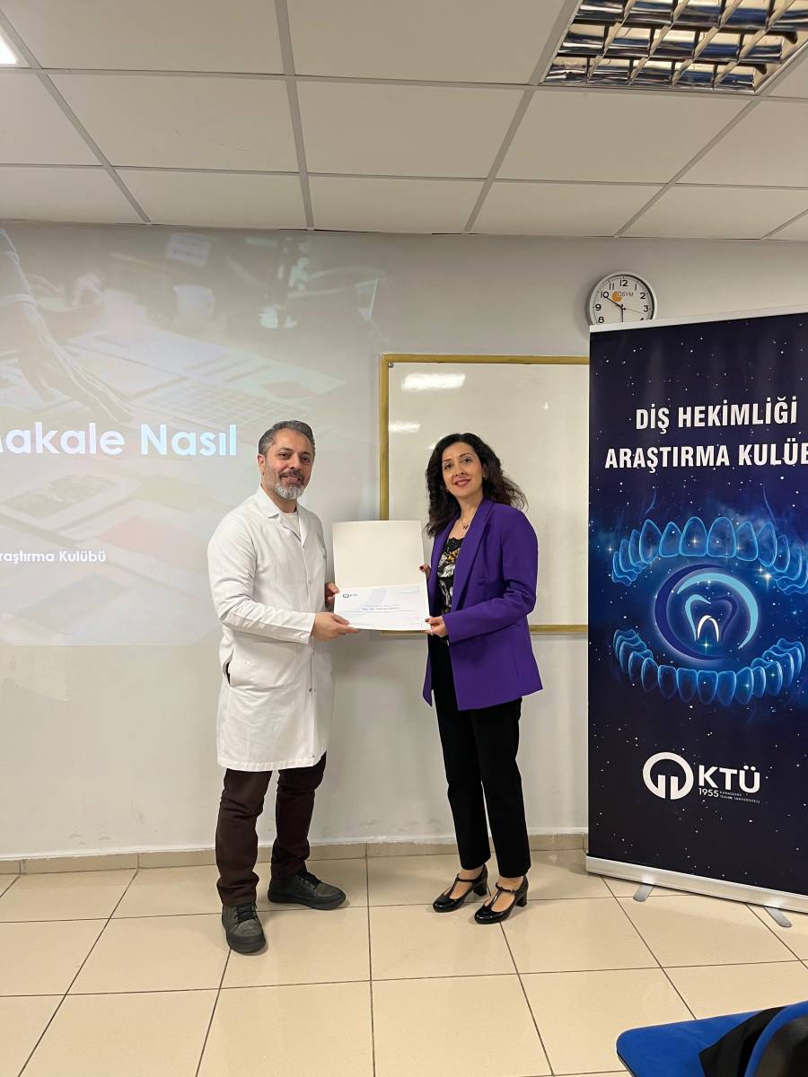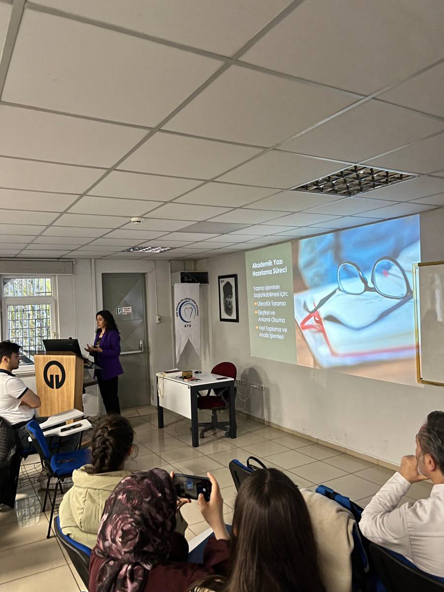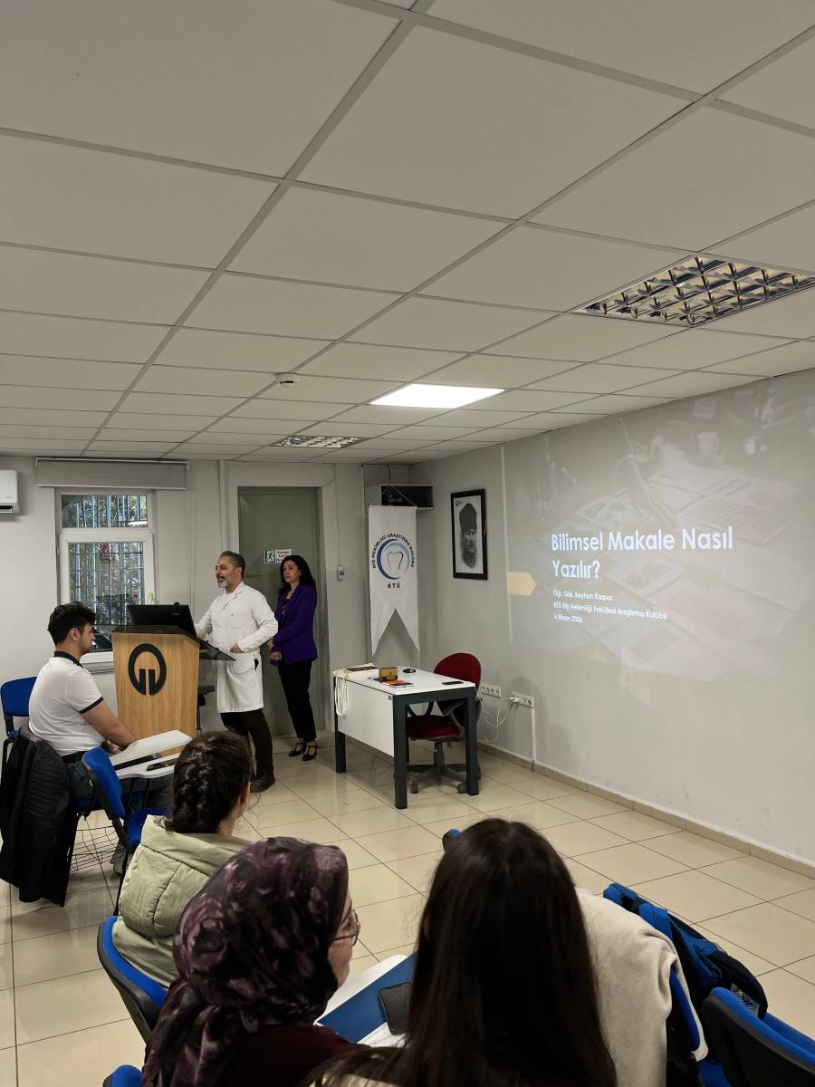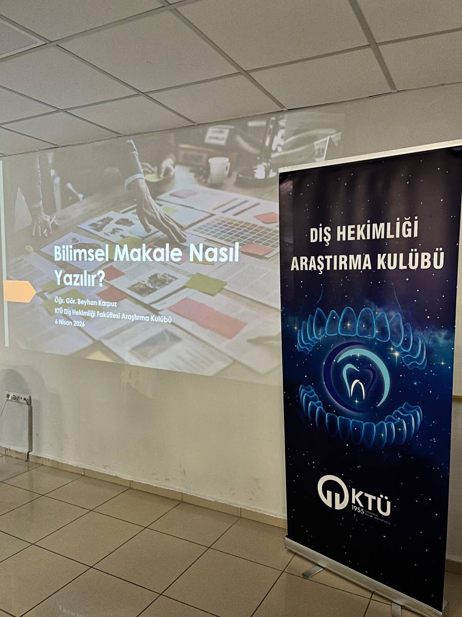 Fakültemiz ve KTÜ Diş Araştırma Kulübü iş birliğiyle planlanan “Bilimsel Makale Yazma Eğitimi” başarıyla gerçekleştirildi. Üniversitemiz Kütüphane ve Dokümantasyon Daire Başkanlığı personeli Öğr. Gör. Beyhan Karpuz’un sunumuyla düzenlenen programda, bilimsel yazım süreci ele alındı. Program kapsamında katılımcılara; bilimsel makale yazımında giriş, yöntem ve bulguların oluşturulması, akademik dil kullanımı, kaynak gösterimi ve yayın süreçleri gibi konularda kapsamlı bilgiler aktarıldı.