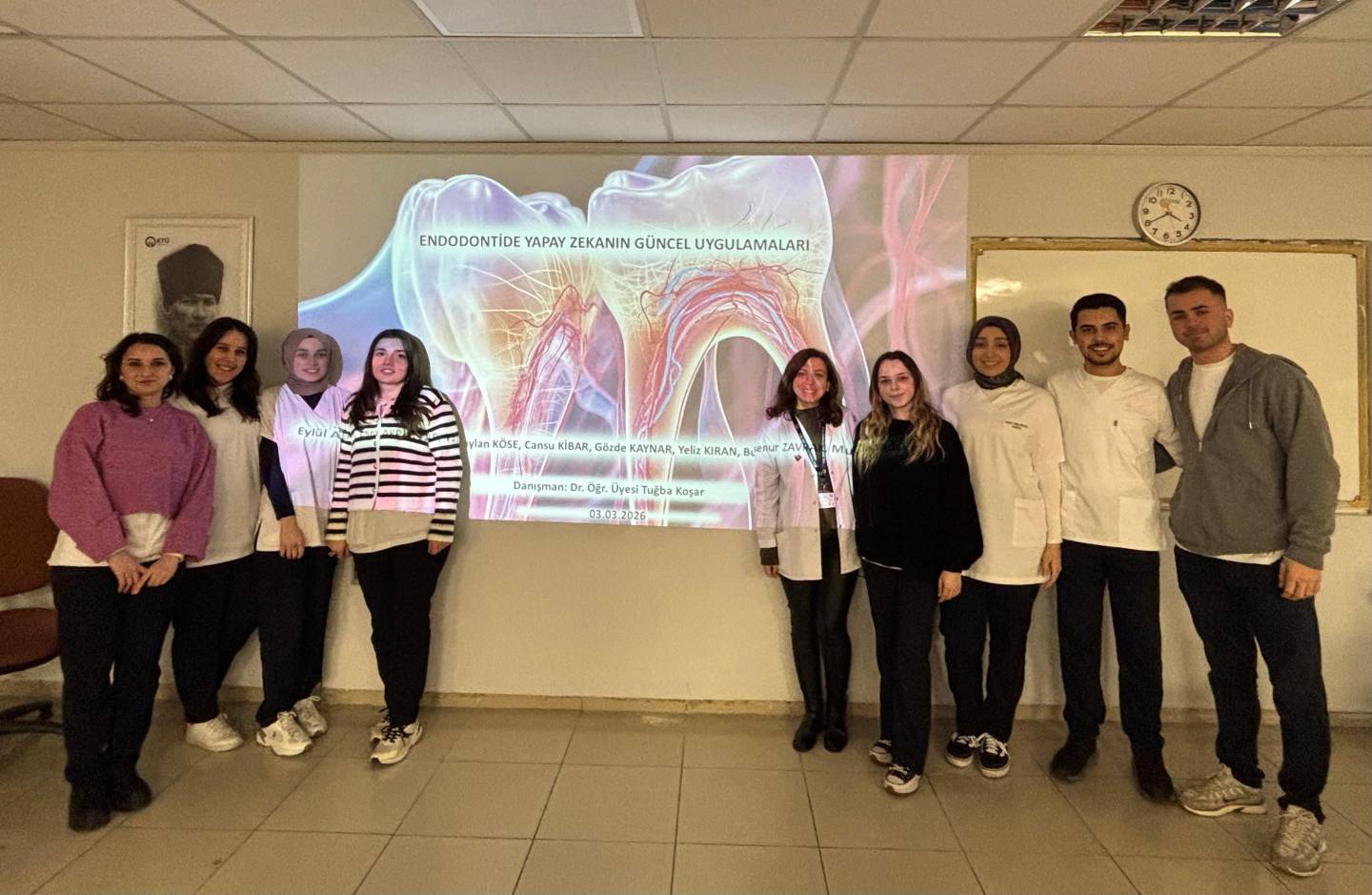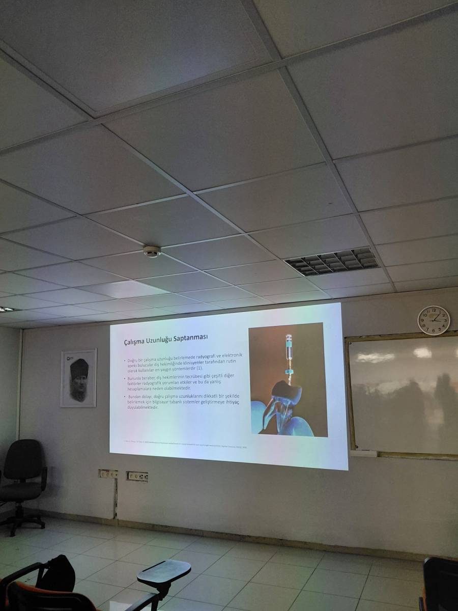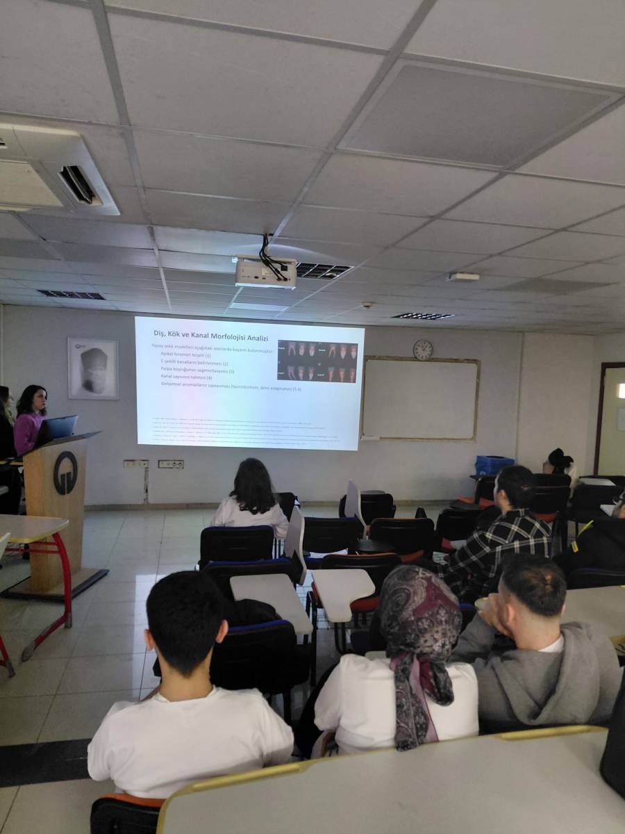Fakültemiz Lisans Programı Dönem V derslerinden “USEC 504 Kanıta Dayalı Diş Hekimliği” dersi kapsamında, Klinik Bilimler Bölümü Endodonti Anabilim Dalı öğretim üyesi Dr. Öğr. Üyesi Tuğba KOŞAR'ın yürütücülüğünde; Stj. Dt. Taylan KÖSE, Stj. Dt. Cansu KİBAR, Stj. Dt. Yeliz KIRAN, Stj. Dt. Gözde KAYNAR, Stj. Dt. Eylül AKAN, Stj. Dt. Busenur ZAVRAK, Stj. Dt. Muhsin YAĞCI ve Stj. Dt. Esra AKPUNAR'ın katkılarıyla "Endodontide Yapay Zekanın Güncel Uygulamaları" başlıklı bilgilendirme semineri gerçekleştirilmiştir.