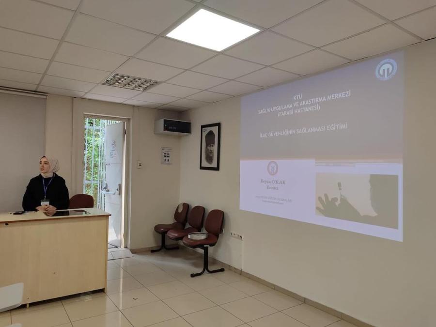 Sağlıkta Kalite Standartları (SKS) kapsamında Fakültemizde yürütülmekte olan hizmet içi eğitim faaliyetlerinde Üniversitemiz Sağlık Uygulama ve Araştırma Merkezi (Farabi Hastanesi) eczacılarından Eczacı Beyza ÇOLAK tarafından Fakültemiz personeline yönelik "İlaç Güvenliği" konulu bilgilendirme eğitimi yapılmıştır.