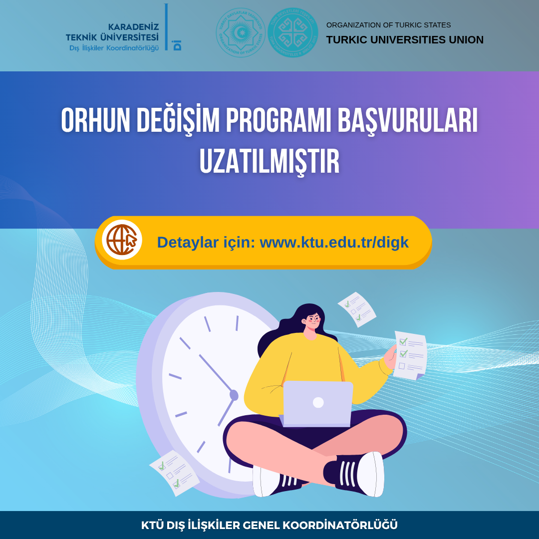 Orhun Değişim Programı başvuruları 31 Mart 2026 tarihine kadar uzatılmıştır. Bu nedenle programa başvuru yapacak KTÜ öğrencilerinin ve personelinin en geç 30 Mart 2026 tarihine kadar başvurularını tamamlamaları gerekmektedir. Detaylar ve başvuru için lütfen tıklayınız.