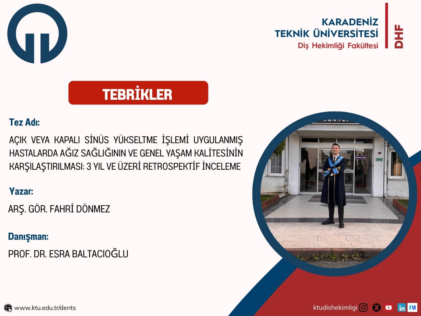 Fakültemiz Klinik Bilimler Bölümü Periodontolji Anabilim Dalı Öğretim Elemanı Arş. Gör. Fahri DÖNMEZ'in Tez Çalışması