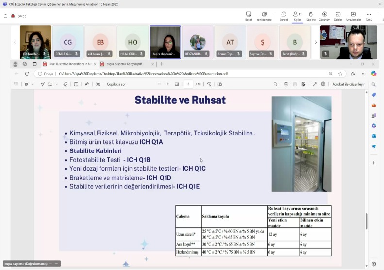 Sosyal, mesleki ve bilimsel alanlarda düzenleyeceğimiz Çevrim İçi Seminer Serisi kapsamında ‘Mezunumuz Anlatıyor’ programımızın ilk konuşmacısı fakültemiz 2024 yılı mezunu Ecz. Büşra DAŞDEMİR oldu. Nobel ilaç firmasında Farmasötik Ar-Ge Uzman Yardımcısı olan Ecz. Büşra DAŞDEMİR, öğrencilerimizi ilaç endüstrisinde eczacının çalışma alanları ve Ar-Ge birimi konularında bilgilendirdi. Deneyimlerini öğrencilerimizle paylaşan ve öğrencilerimizden gelen soruları içtenlikle cevaplayan Ecz. Büşra DAŞDEMİR’e etkinliğimize katkılarından dolayı teşekkür ediyoruz.