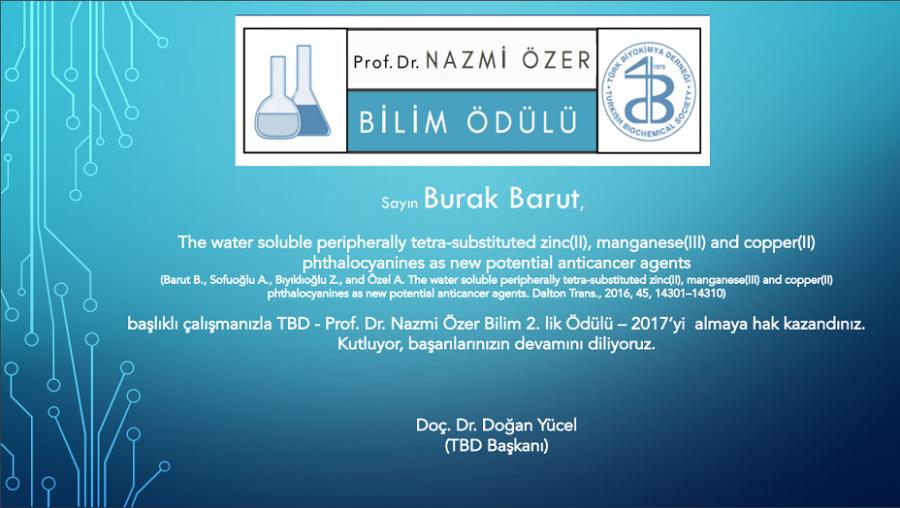 Biyokimya Anabilim Dalı Araştırma Görevlisi Burak BARUT ve danışmanı Yrd. Doç. Dr. Arzu ÖZEL bu yıl Erzurum’da yapılan Uluslararası Biyokimya Kongresi-2017 28. Ulusal Biyokimya Kongresi'nde, "The water soluble pheripherally tetra-substituted zinc(II), manganese(III) and copper(II) phthalocyanines as new potential anticancer agents" başlıklı çalışmaları ile biyokimya alanında prestijli ödüllerden biri olan "Prof. Dr. NAZMİ ÖZER BİLİM ÖDÜLÜ"ne layık görüldüler. Çalışmadaki diğer araştırmacılar Fen Fakültesin Anorganik Kimya Anabilim Dalı’ndan Doç. Dr. Zekeriya BIYIKLIOĞLU ve öğrencisi Ayşenur SOFUOĞLU’dur.