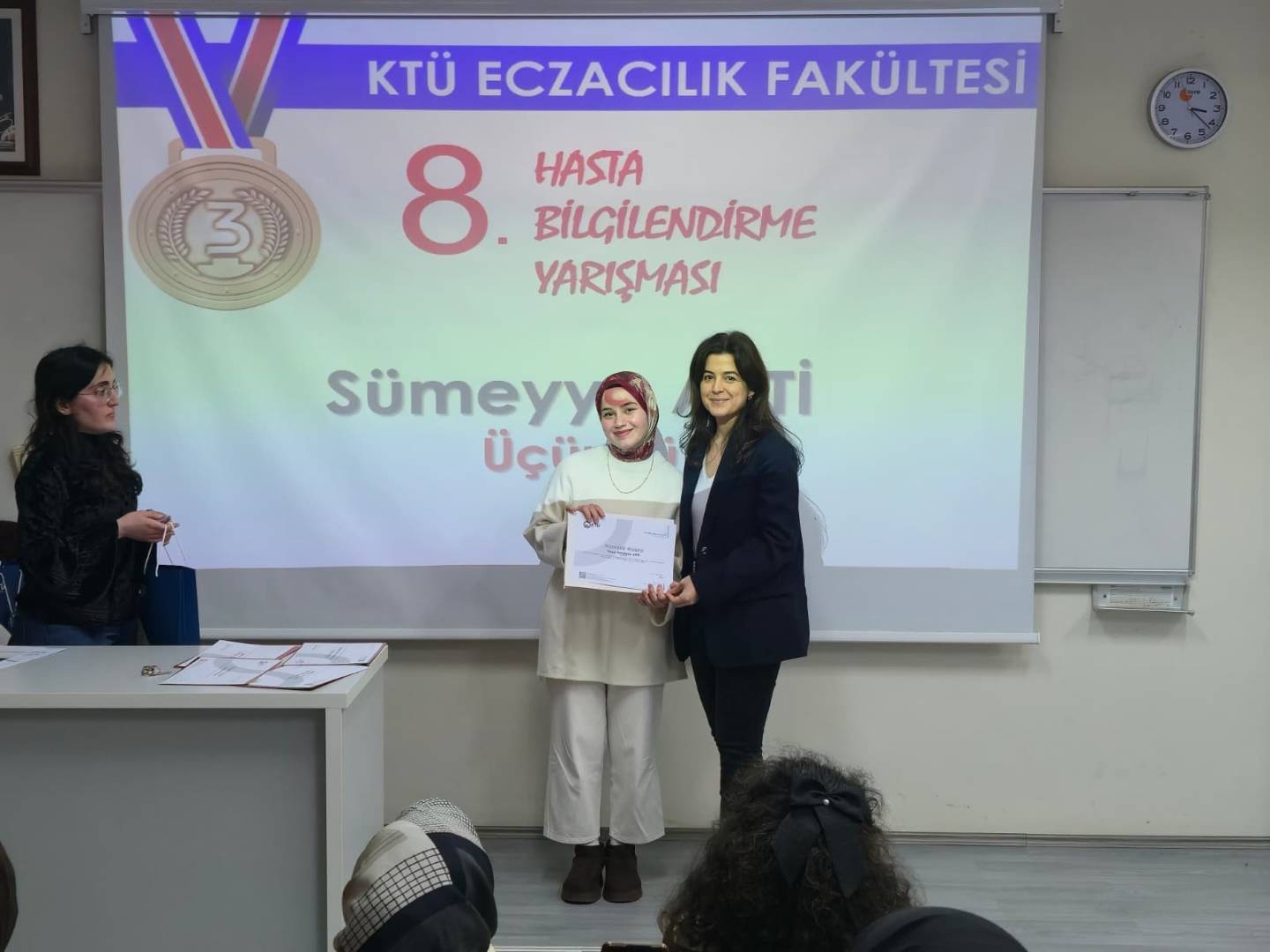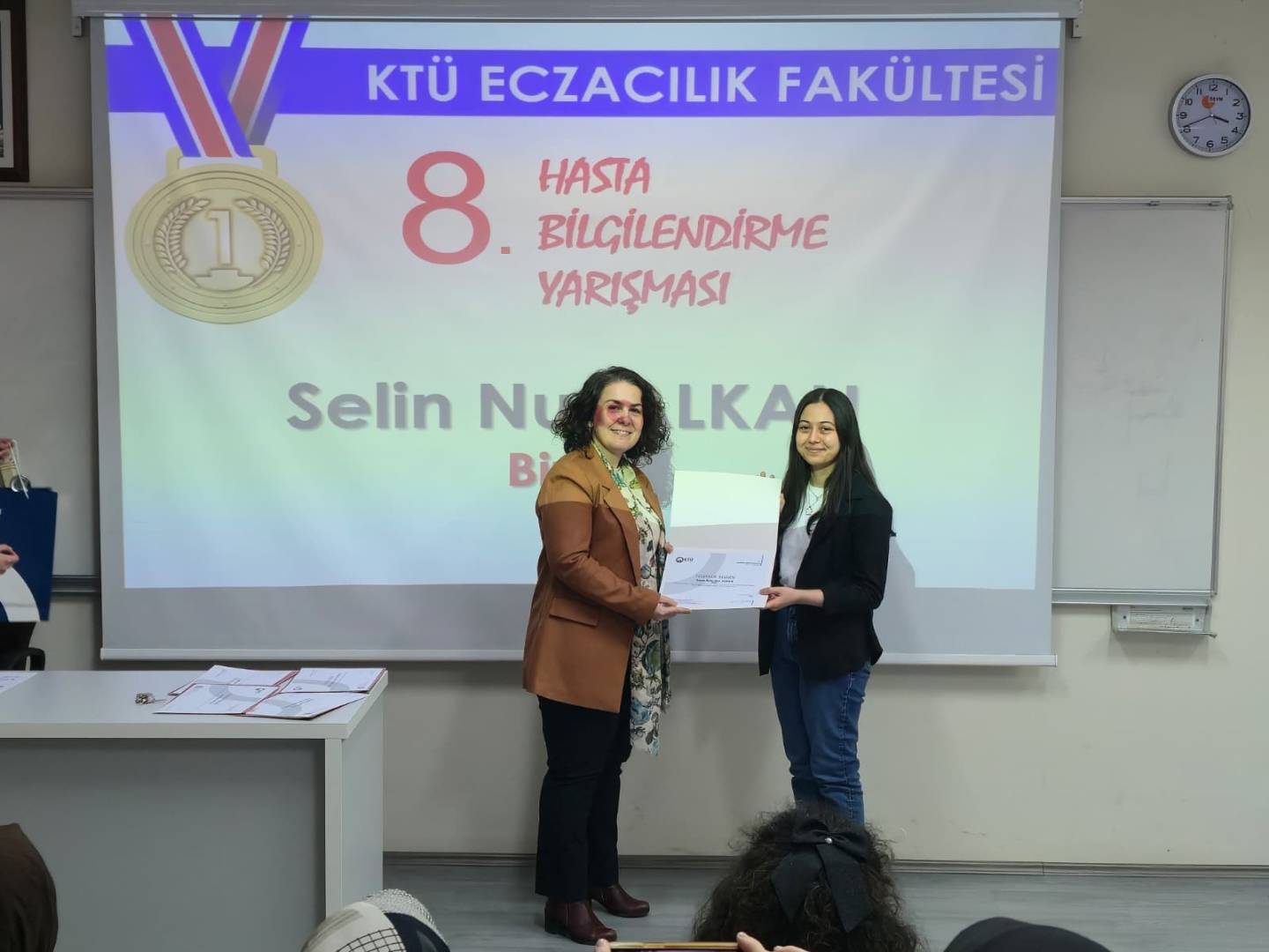 Birinci olan öğrencimiz Selin Nur ALKAN, Fakültemizi 24-26 Nisan 2025 tarihlerinde Ankara’da düzenlenecek olan 22. Ulusal Hasta Bilgilendirme Yarışması’nda temsil edecektir. Öğrencimizi tebrik ediyor, 22. Ulusal Hasta Bilgilendirme Yarışması’nda başarılar diliyoruz.