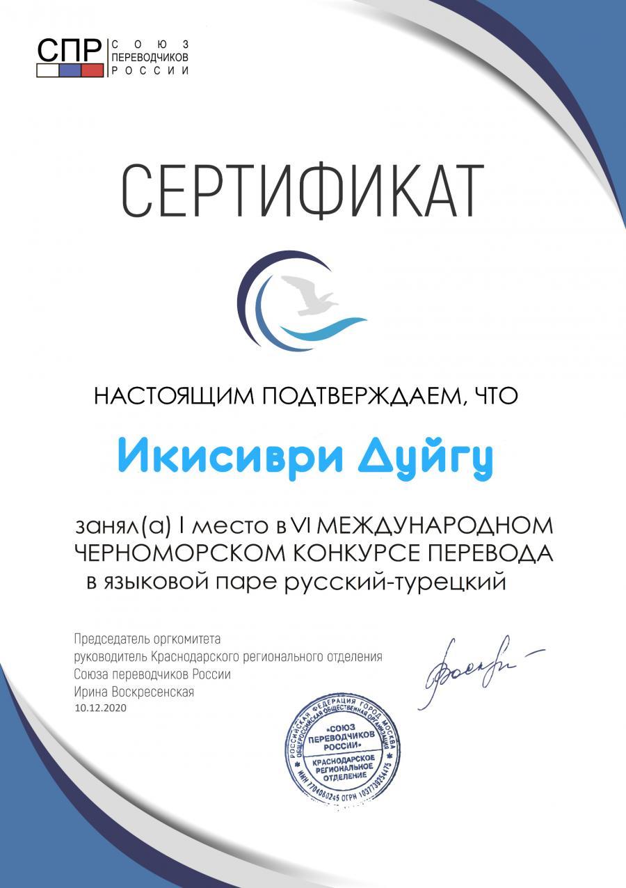 Bölümümüzün öğretim elemanlarından Arş. Gör. Duygu İkisivri, Rusya Çevirmenler Birliği'nin Krasnodar Bölge Şubesi (Краснодарскoe региональнoe отделение Союзa переводчиков России) tarafından düzenlenen VI. Uluslararası Karadeniz Deniz Sanatı Çeviri Yarışmasında (VI международный черноморский конкурс перевода маринистики) sanatsal düzyazı, şiir ve Karadeniz'in ekolojik sorunlarına dikkat çekilen bilimsel makale olmak üzere üç alanda Rusçadan Türkçeye çeviri kategorisinde birincilik elde etmiştir. Kendisini tebrik eder, başarılarının devamını dileriz.