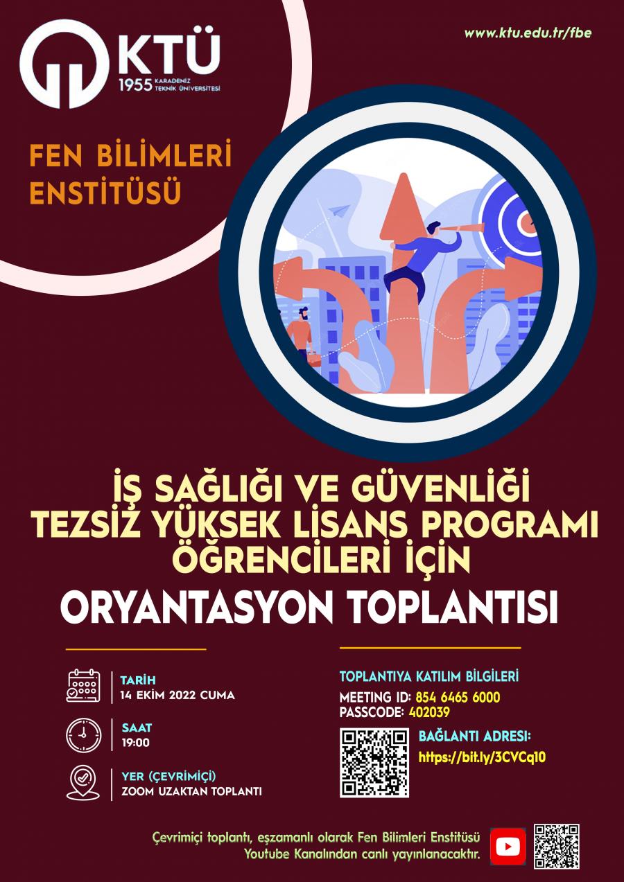 Enstitümüzde öğrenim görmekte olan İş Sağlığı ve Güvenliği Tezsiz Yüksek Lisans programı öğrencilerimiz için 14 Ekim 2022 Cuma Günü Saat 19:00’da ZOOM Uzaktan Toplantı Uygulaması üzerinden çevimiçi olarak Oryantasyon Toplantısı düzenlenecektir.