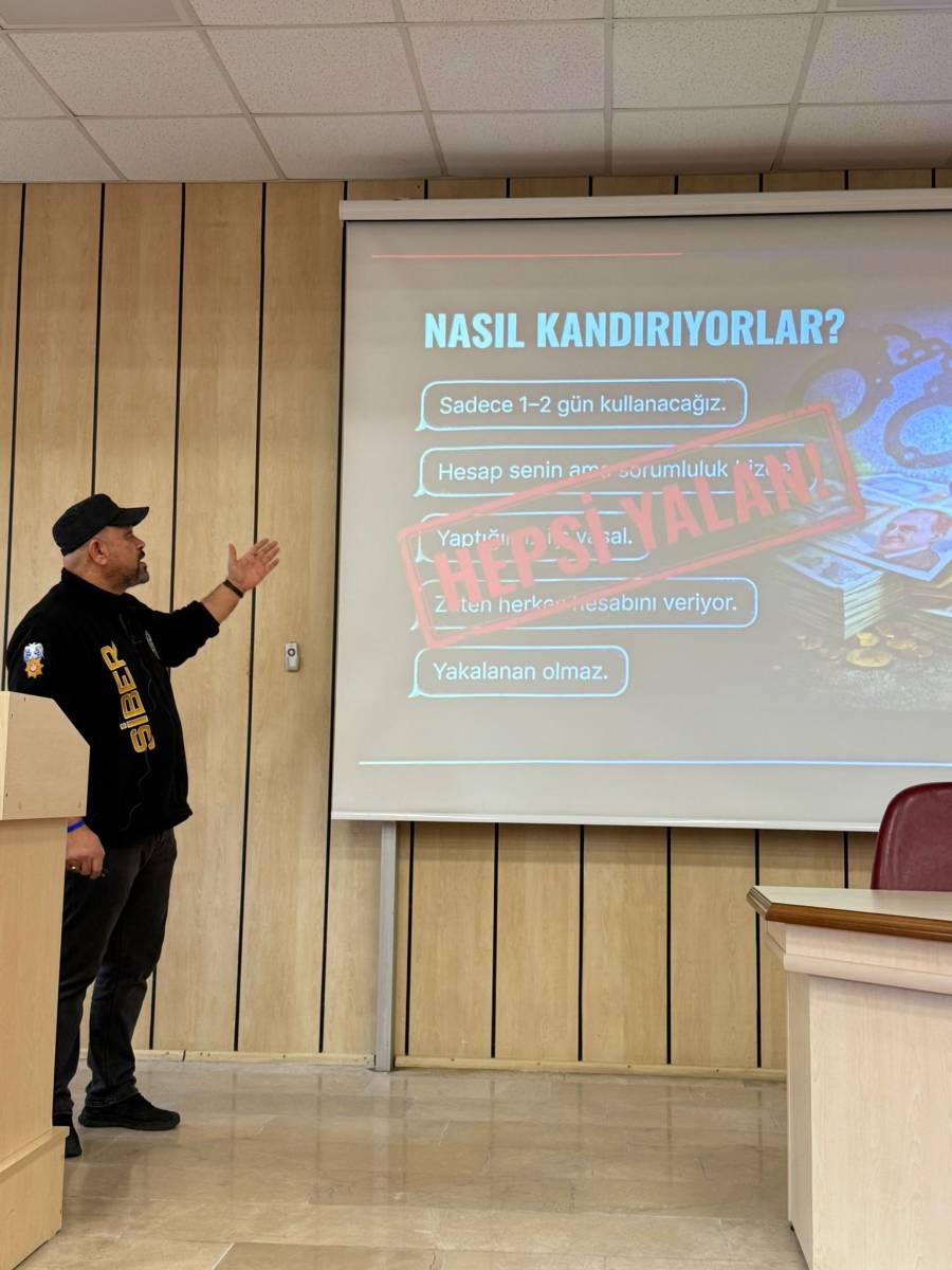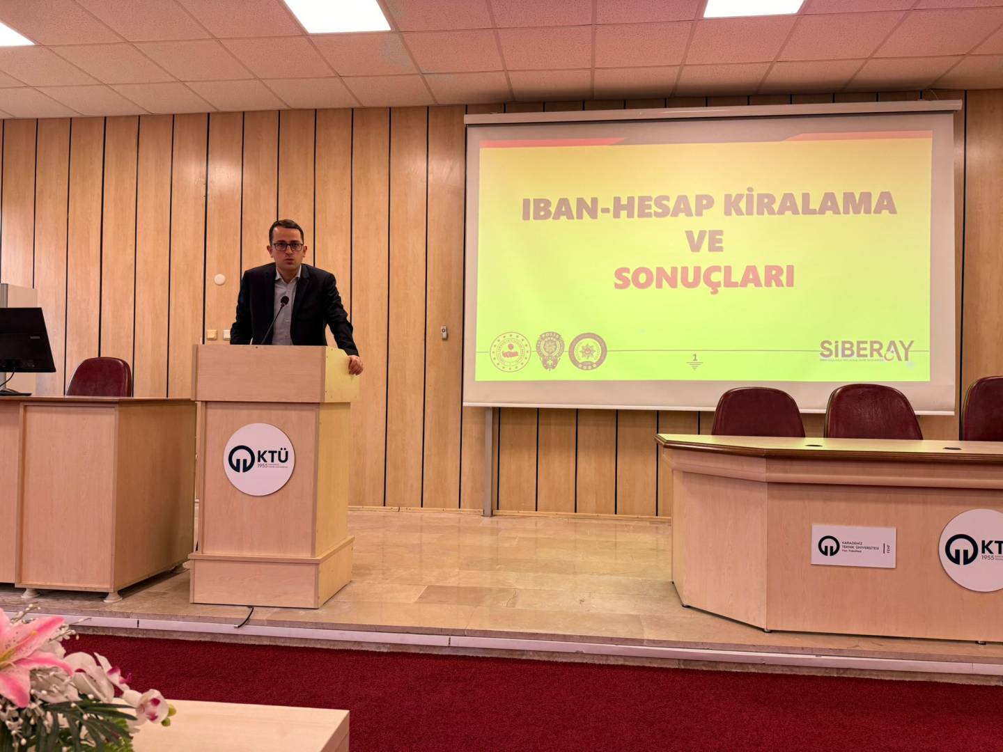 Trabzon Cumhuriyet Başsavcılığı ile Üniversitemiz arasında kurumsal iş birliğinin güçlendirilmesi amacıyla Savcı Abdulkerim BAŞBAY ve Siber Suçlarla Mücadele Şube Müdürlüğünden polis memuru İlhan TOZLUYURT tarafından düzenlenen eğitimde; sosyal medya hesabını kiralama sonucunda karşılaşılan dolandırıcılık ve siber suçlar sonucunda karşılaşılabilecek suçlar üzerinde duruldu.