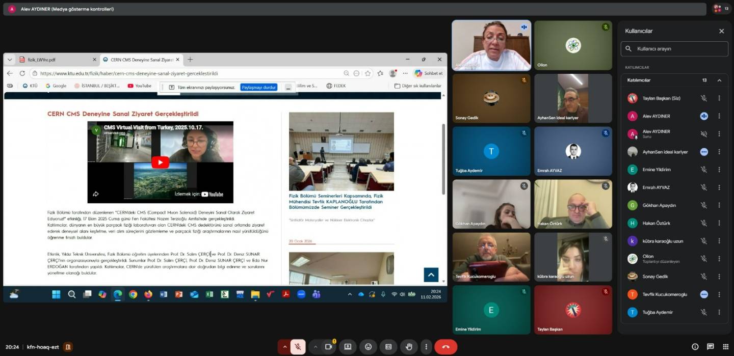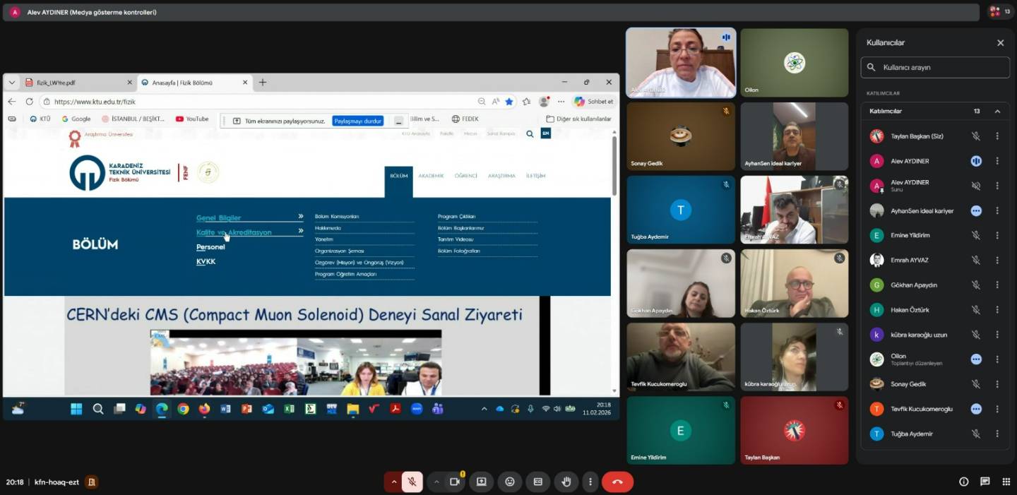 11 Şubat 2026 tarihinde çevrimiçi olarak gerçekleştirilen Fizik Bölümü 3. Dış Paydaş Toplantısında, 2025–2026 Eğitim-Öğretim Yılı güz yarıyılı faaliyetleri değerlendirilmiş ve bahar dönemi için planlanan çalışmalar ele alınmıştır.