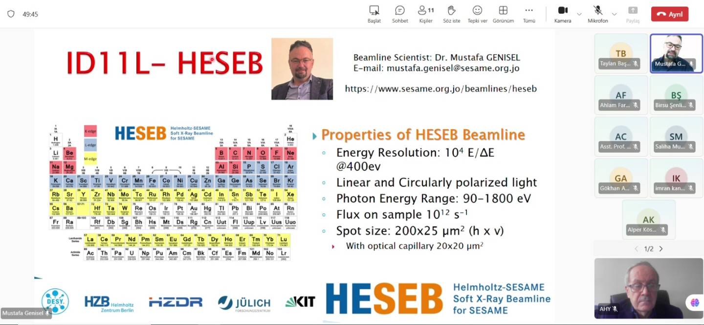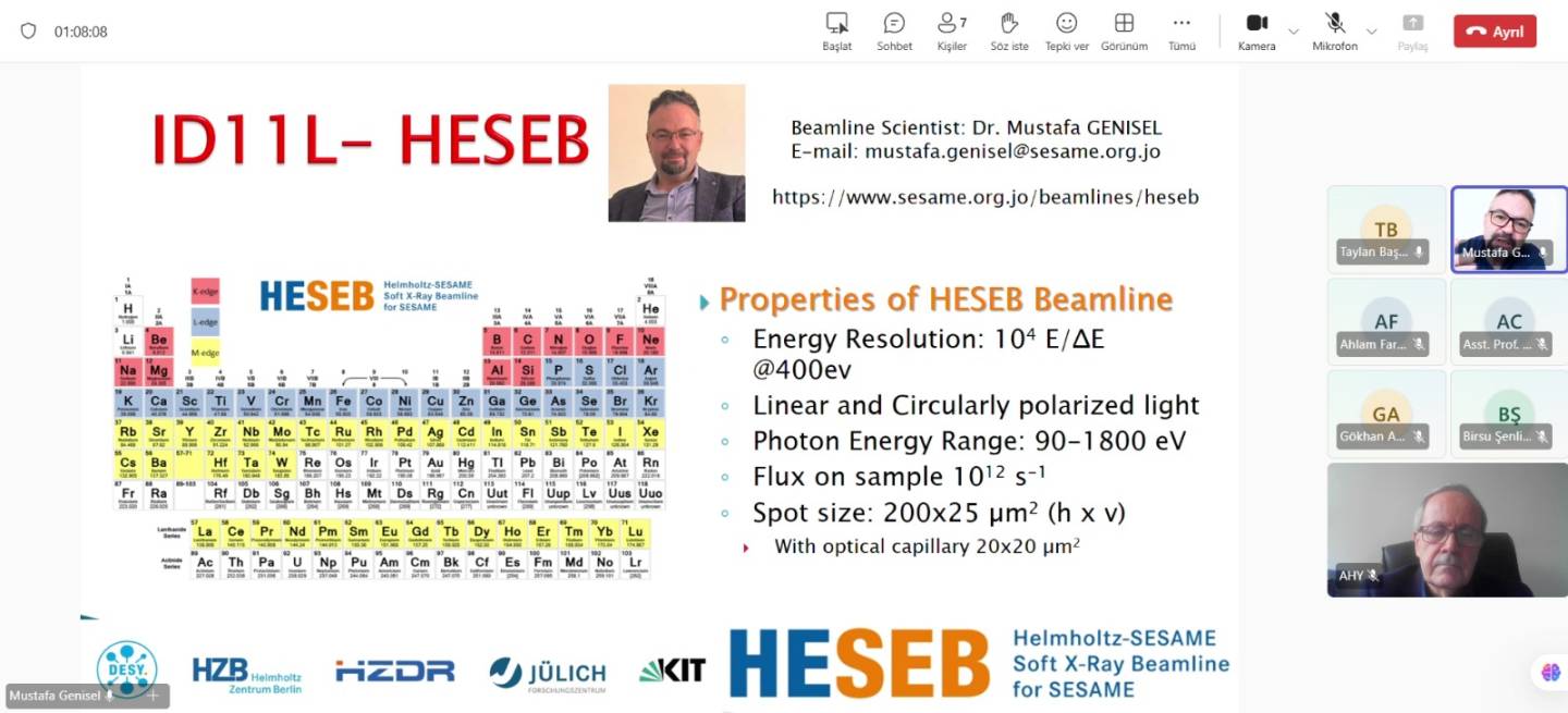 11.02.2026 Çarşamba günü Fizik Bölümü etkinlikleri kapsamında, Ortadoğu’nun Uluslararası Sinkrotron Işığı Mükemmeliyet Merkezi; SESAME’den (Synchrotron-light for Experimental Science and Applications in the Middle East), HESEB Demethattı Sorumlusu Dr. Mustafa Fatih GENİŞEL “SESAME ve Araştırma Olanakları” başlıklı bir çevrimiçi seminer gerçekleştirdi. Ürdün SESAME’den gerçekleştirilen bu seminer kapsamında, Dr. Mustafa Fatih GENİŞEL tarafından Türkiye’nin de ortağı olduğu bu araştırma laboratuvarındaki sinkrotron ışığının bilim ve teknolojideki kritik rolü, SESAME’nin sunduğu ileri araştırma olanakları, demet hatları ve kullanıcı olma süreçleri ayrıntılı olarak ele alındı.