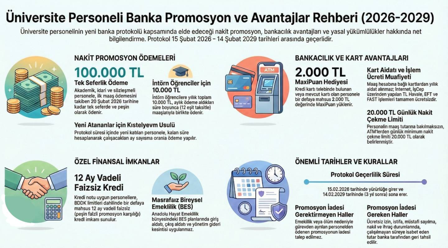 • Protokol kapsamında, Üniversitemizde her türlü statüde görev yapan akademik personel, idari personel, 4/B kapsamında sözleşmeli personel, yabancı uyruklu sözleşmeli personel, yabancı uyruklu uzmanlık öğrencileri ve doktora sonrası araştırmacılara; kişi başına 100.000,00 TL tutarındaki nakit promosyon ödemesi, banka tarafından ilk maaş ödemesini müteakip, 20 Şubat 2026 tarihine kadar, bir defada ve peşin olarak yapılacaktır.