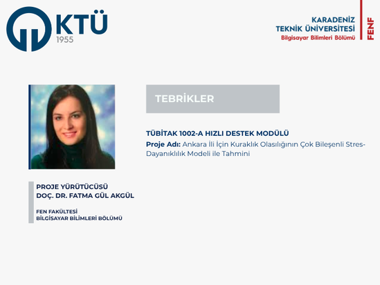Bölümümüz Öğretim Üyelerinden Doç. Dr. Fatma Gül AKGÜL’ün “Ankara İli İçin Kuraklık Olasılığının Çok Bileşenli Stres-Dayanıklılık Modeli İle Tahmini” başlıklı projesi, “TÜBİTAK-1002 Hızlı Destek Modülü” kapsamında desteklenmiştir.