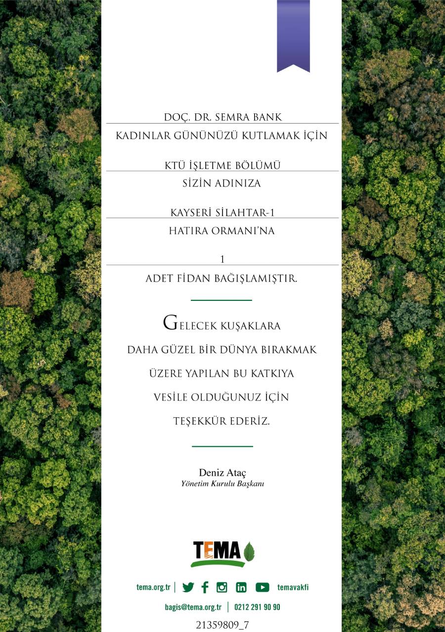 KTÜ İşletme Bölümü 8 Mart Dünya Kadınlar Günü kapsamında kadın akademik ve idari personeli adına TEMA Vakfı'na fidan bağışında bulundu.