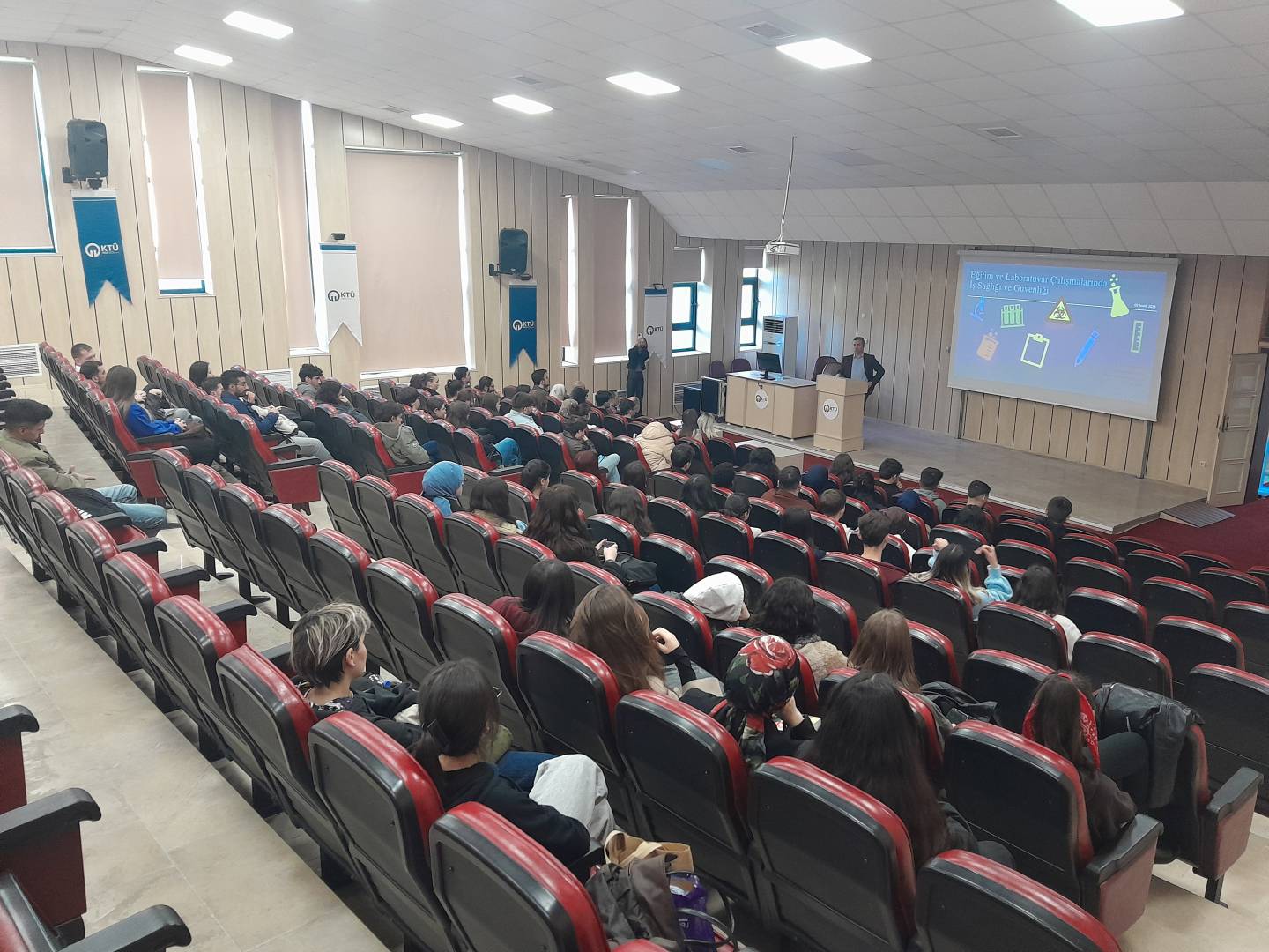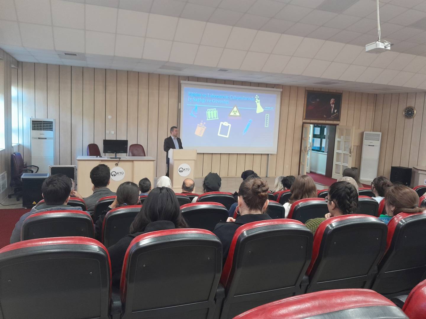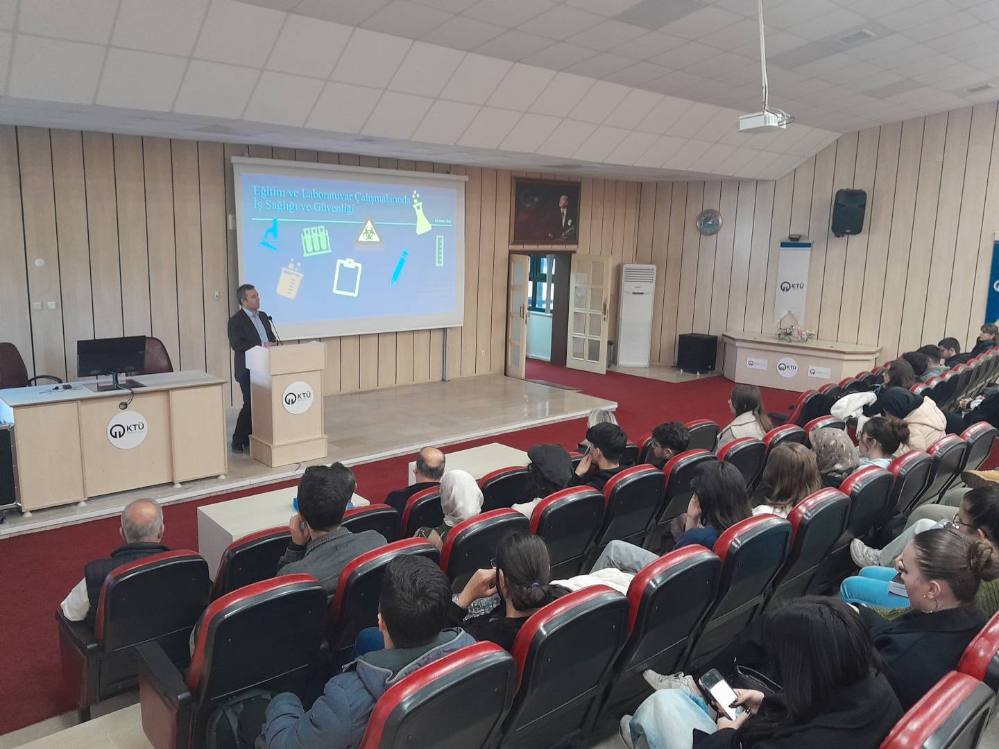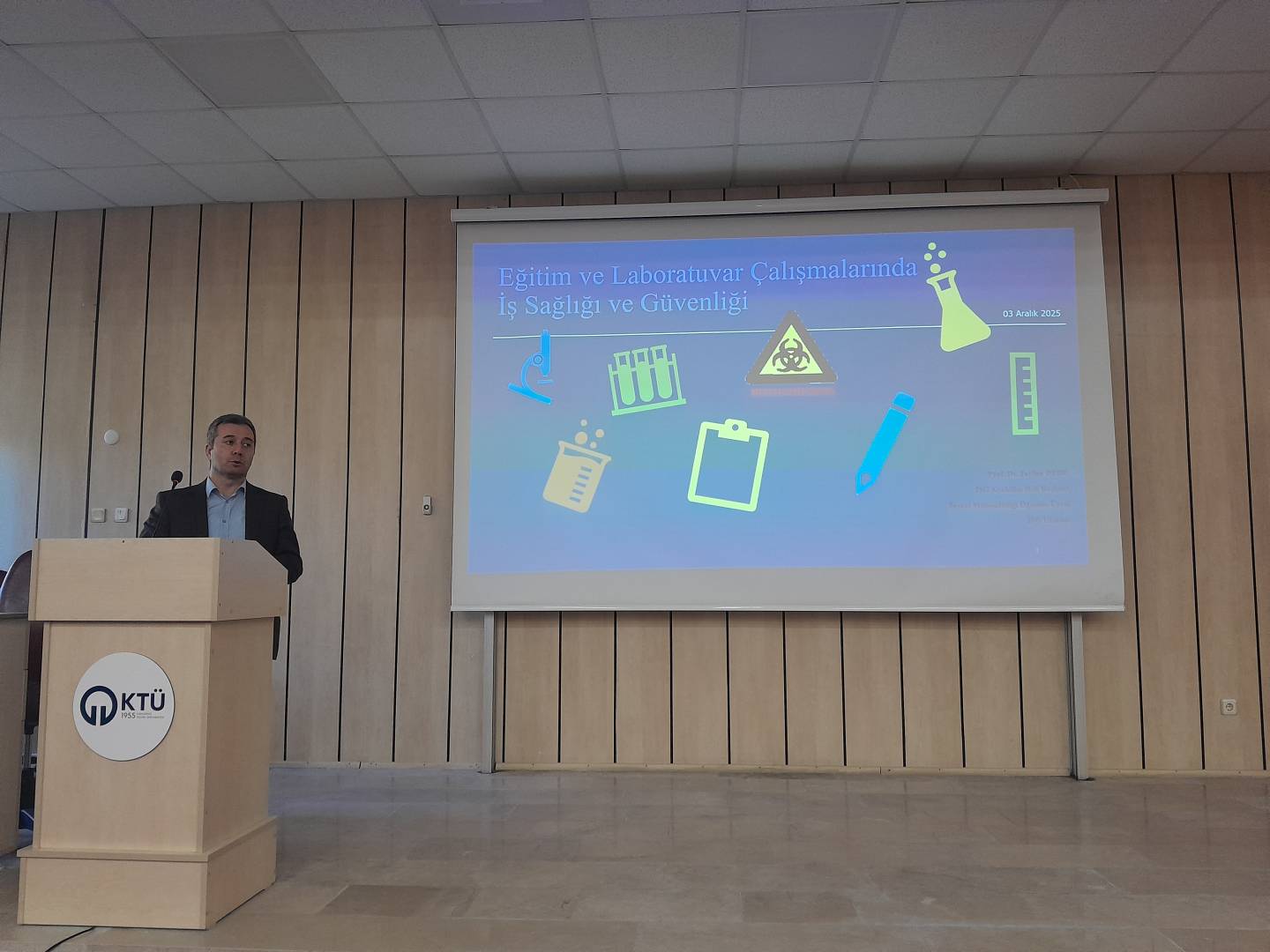 "Bilginin topluma yayılması amacıyla düzenlenen/icra edilen faaliyet sayısı kapsamında" KTÜ Kimya Bölümü Yönetimi olarak öğrencilerimiz için İş Sağlığı ve Güvenliği Eğitimi düzenledik. İş Sağlığı ve Güvenliği Anabilim Dalı Başkanı Prof. Dr. Tayfun Dede, 03 Aralık 2025 tarihinde saat 15.00’te Nazım Terzioğlu Amfisinde bölümümüz öğrencilerine yönelik "Eğitim ve Laboratuvar Çalışmalarında İş Sağlığı ve Güvenliği" başlıklı kapsamlı bir seminer verdi.